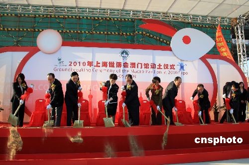5月8日,2010年上海世博會澳門館舉行動土儀式。澳門特別行政區(qū)經(jīng)濟(jì)財政司司長譚伯源、中央人民政府駐澳門特別行政區(qū)聯(lián)絡(luò)辦公室副主任高燕、上海世博會執(zhí)行委員會專職副主任鐘燕群等為儀式主禮,來自澳門的立法議員、人大代表、工商界以及國際商會代表等超過150人出席儀式。澳門館─“玉兔宮燈”位于中國館區(qū),主體建筑高19.99米,寓意澳門回歸的年份1999,別具意義。中新社發(fā) 潘索菲 攝