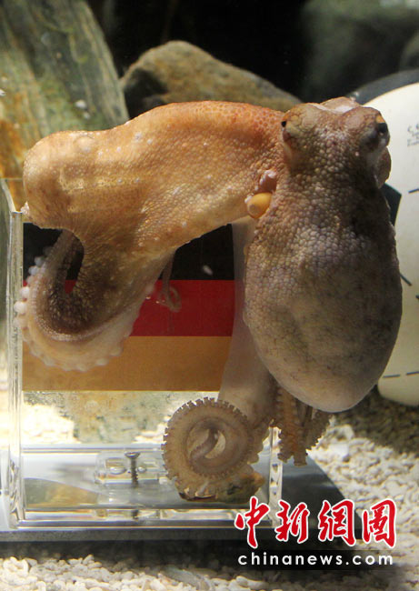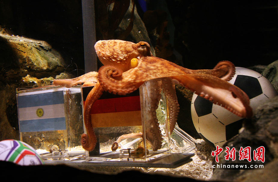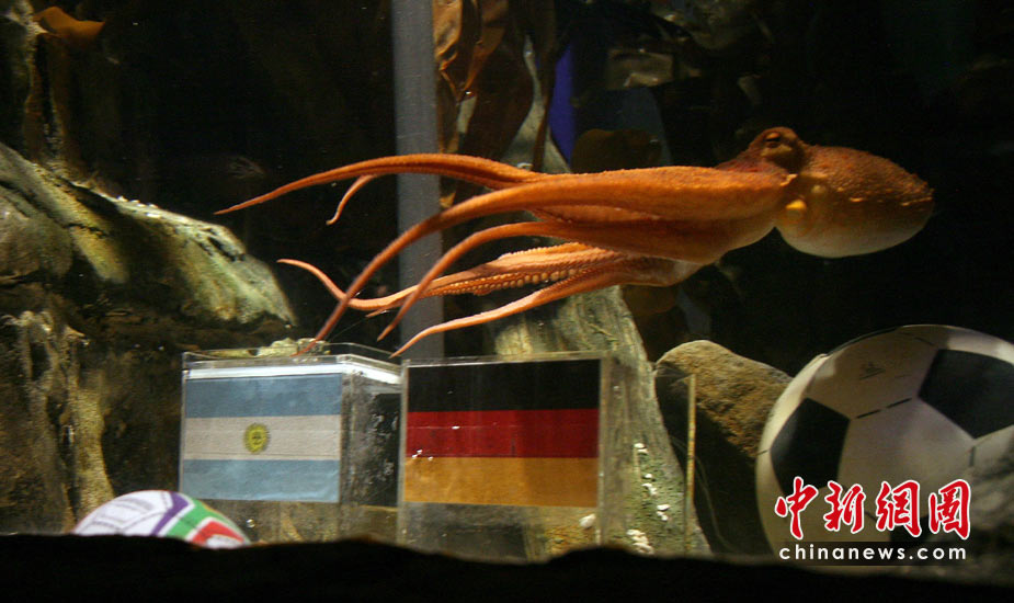 據(jù)悉,海洋館員把分別印有德、阿旗幟的貝殼放入玻璃缸,與對英格蘭隊比賽前脆快取出德國那枚貝殼不同,章魚“保羅”對德國和阿根廷的對決有些“猶豫不決”,“考慮了長達(dá)一小時”但是最終還是取出了印有德國旗幟的貝殼。
