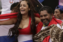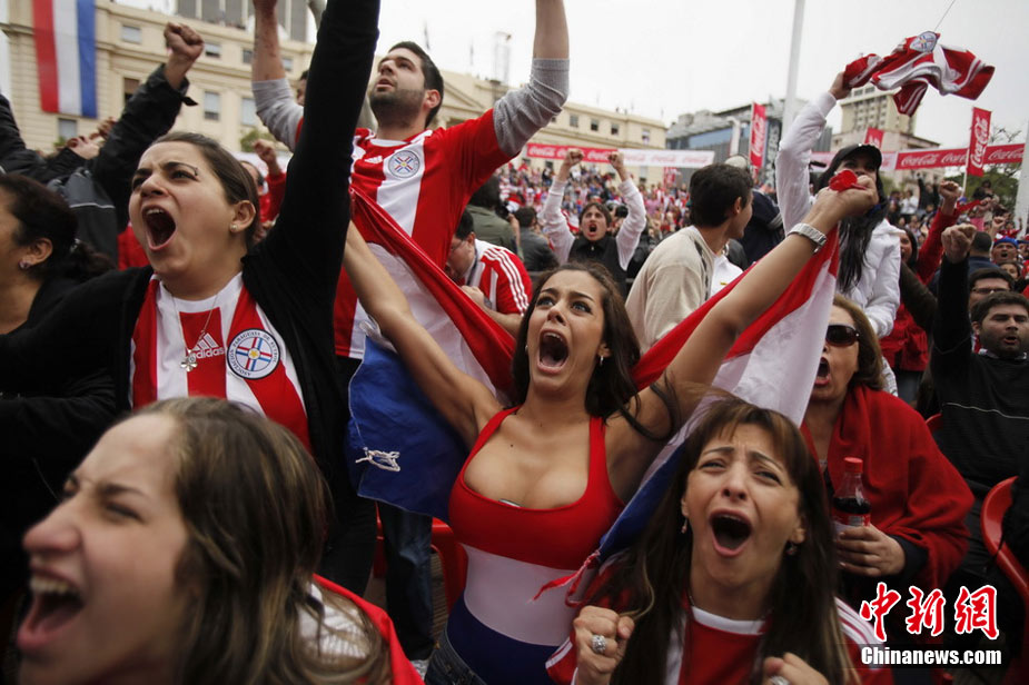 6月29日,巴拉圭點球大戰(zhàn)5-3擊敗日本。著名乳神女球迷拉里薩再度胸夾手機(jī)亮相,并與日本球迷同樂,瘋狂慶祝盡顯激情狂野。