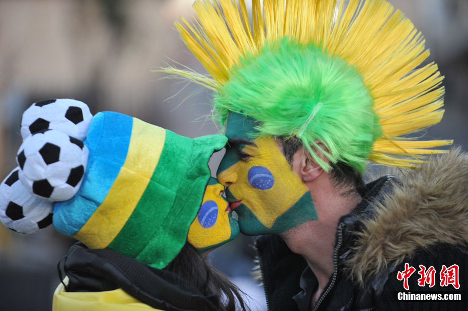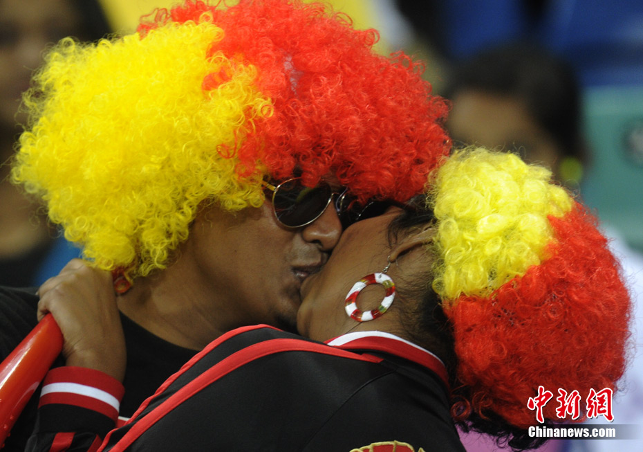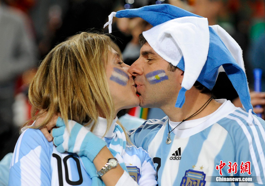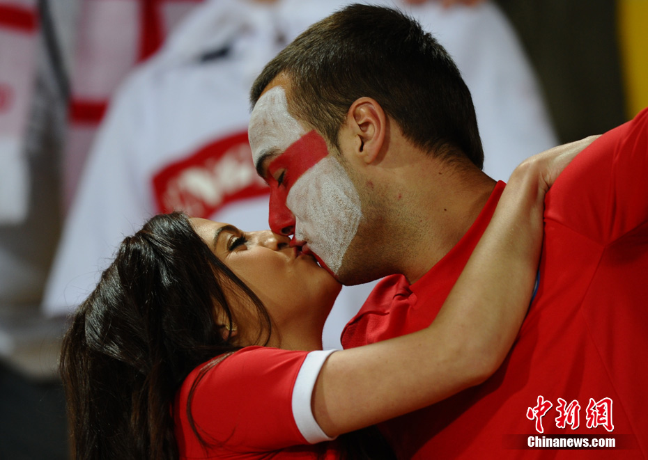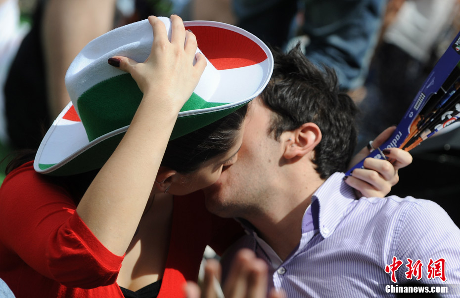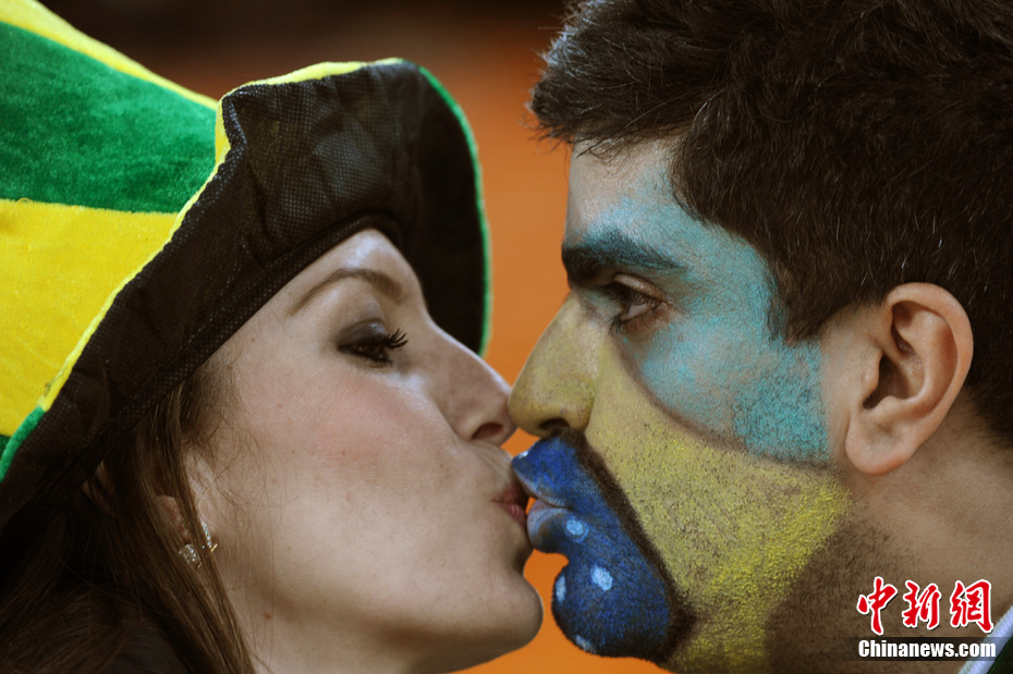 足球讓女人走開不是真理,與愛人共同享受足球之魅才是幸福?磁_(tái)上愛侶的濃情蜜意著實(shí)讓人羨慕,情到深處的深深一吻,獻(xiàn)給愛人,也獻(xiàn)給令人癡迷的世界杯。中新社記者 廖攀 攝