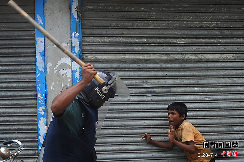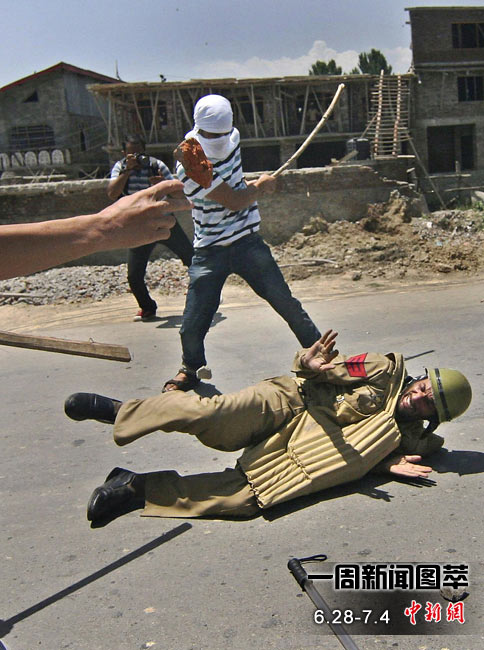 28日(周一),在印控克什米爾地區(qū)首府斯利那加市郊,當地穆斯林在舉行抗議活動時與警察發(fā)生沖突,兩名穆斯林在沖突中喪生。圖為警察在沖突中被打倒在地。