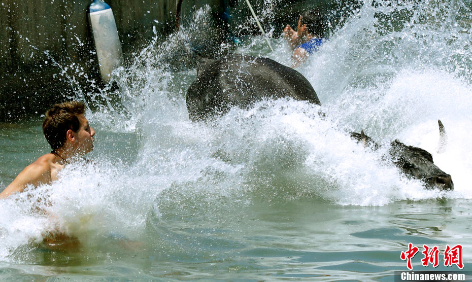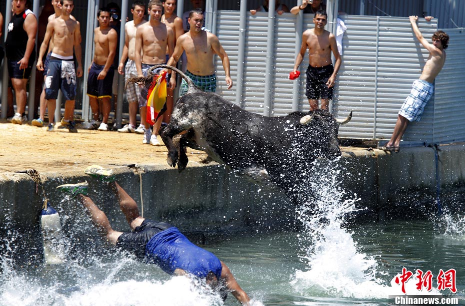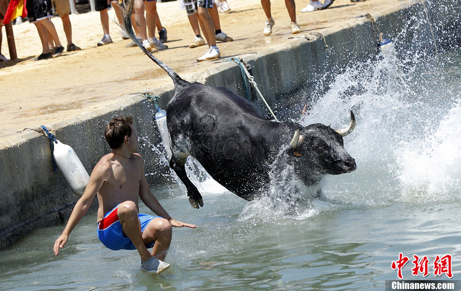 7月5日,西班牙東部德尼那小鎮(zhèn)一年一度的海邊奔牛節(jié)再度舉行。這里的奔牛節(jié)與眾不同,斗牛士們挑逗著一頭頭暴躁的公牛跳入海中,俗稱“奔牛入海”場(chǎng)面蔚為壯觀。