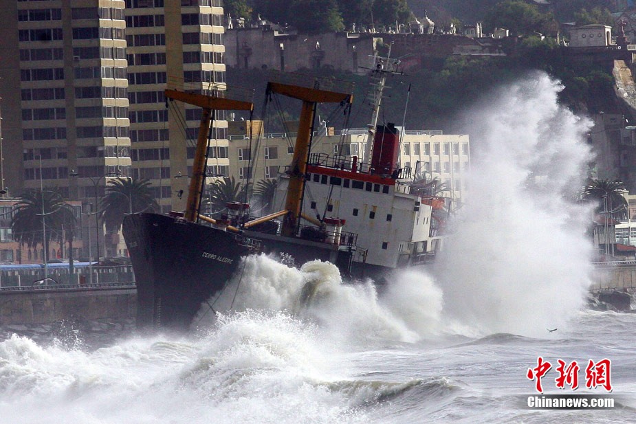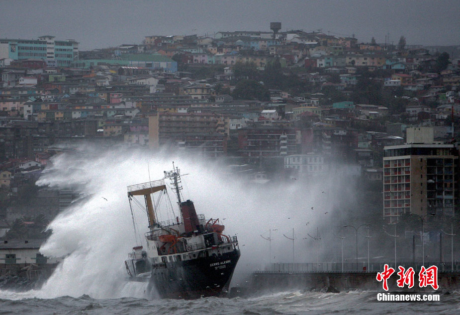 7月6日,受強(qiáng)風(fēng)、暴雨等惡劣天氣影響,智利中南部地區(qū)多處重要海港被迫封鎖。在智利瓦爾帕萊索港口,一艘貨輪因強(qiáng)風(fēng)擱淺,并在巨浪沖擊下撞向岸堤。