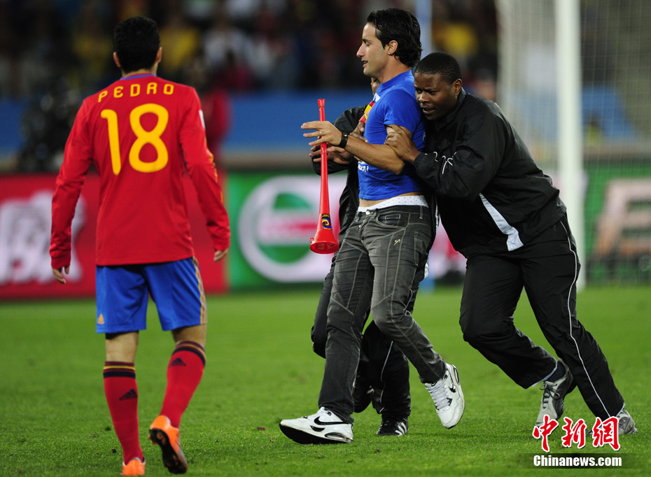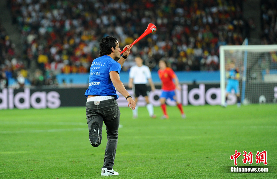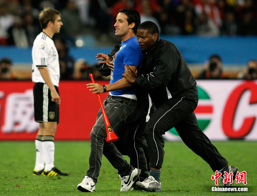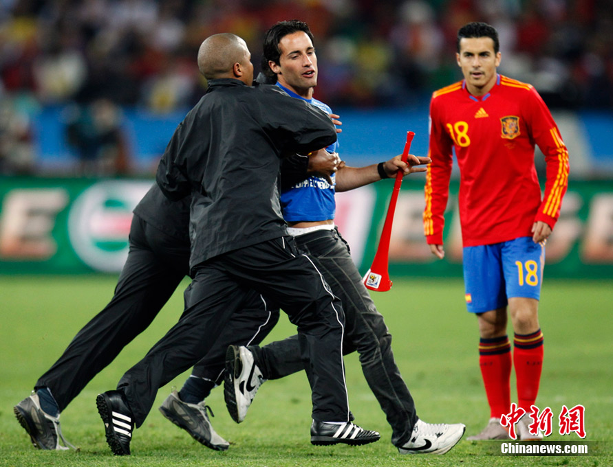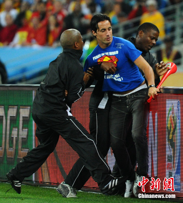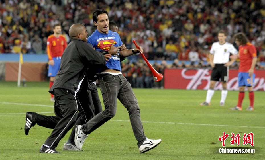 西班牙隊和德國隊激戰(zhàn)正酣時。一名球迷身穿超人背心突然闖進球場,此時雙方的比賽短暫地暫停了一會兒,球迷被保安推出了球場。后經有關部門證實,這是一名意大利球迷。