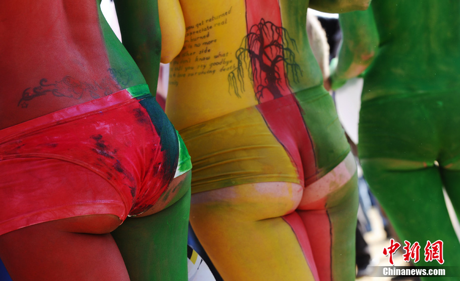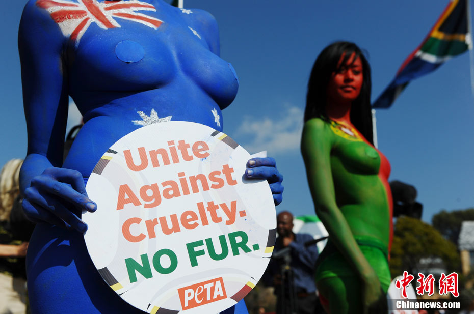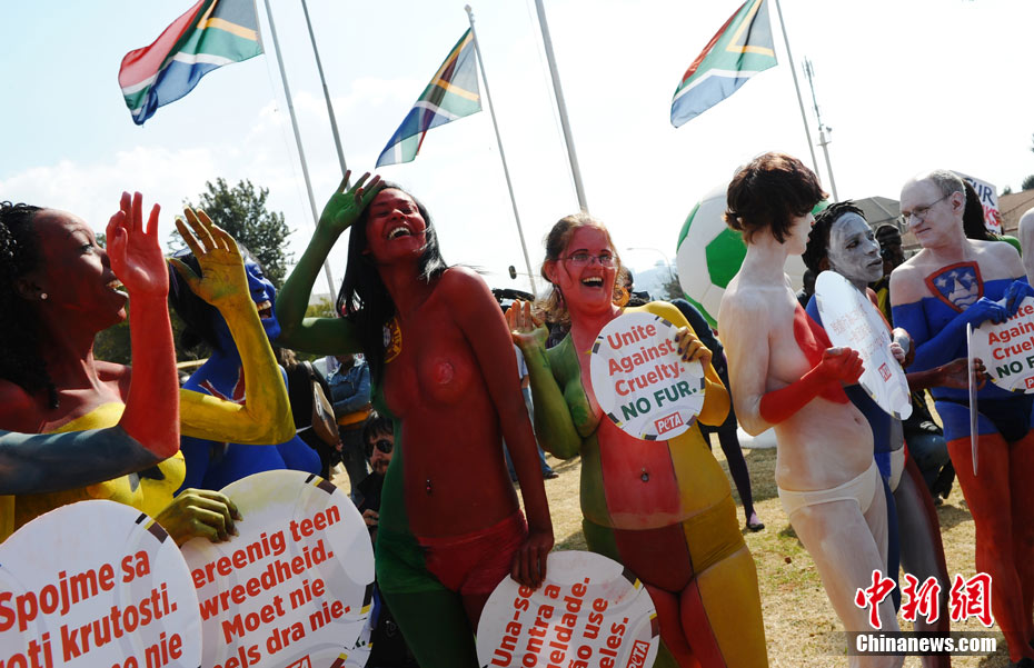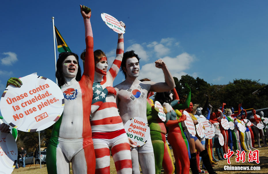 7月8日,南非世界杯賽場(chǎng)外,善待動(dòng)物組織(PETA)舉行彩繪游行。參與者身體上畫各國(guó)的國(guó)旗,并舉著寫有“團(tuán)結(jié)起來(lái) 抗議使用皮草”的標(biāo)語(yǔ)牌。