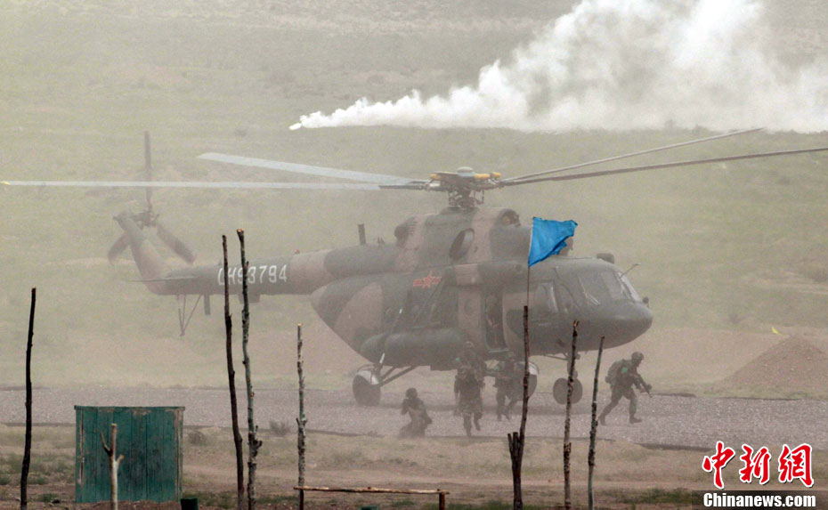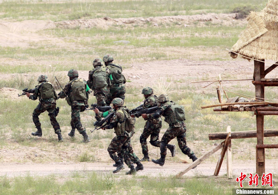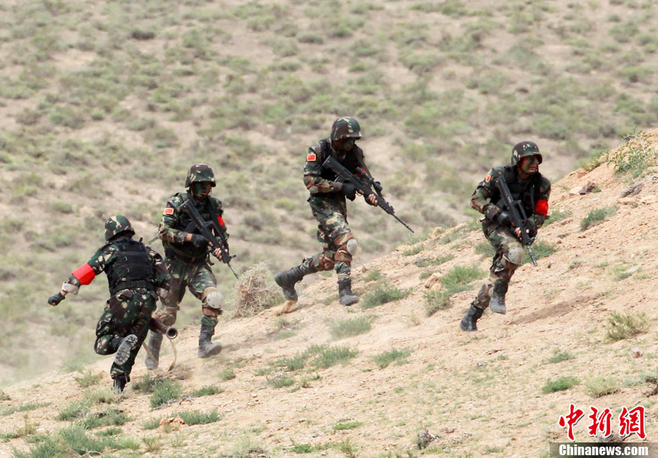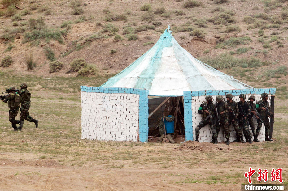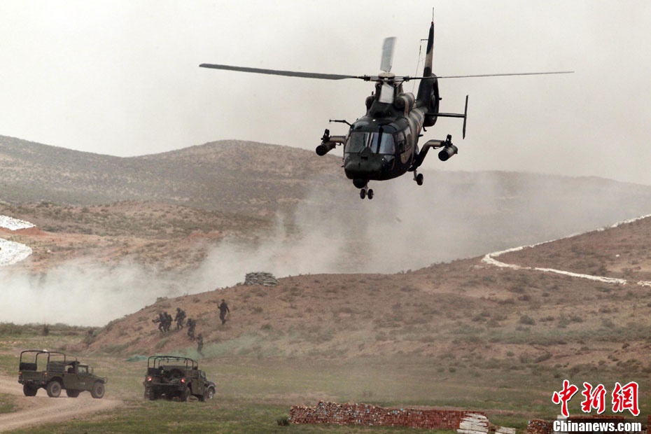 7月9日,友誼-2010”中巴反恐聯(lián)訓(xùn)在蘭州軍區(qū)某訓(xùn)練基地舉行實(shí)兵實(shí)彈演練,演練設(shè)計(jì)的背景是,對(duì)潛入中巴邊境地區(qū)實(shí)施襲擊破壞的國際恐怖分子進(jìn)行聯(lián)合打擊。圍繞“邊境地區(qū)山地聯(lián)合反恐作戰(zhàn)”這一課題,演練了遠(yuǎn)程投送、偵察監(jiān)視、立體封控、精確打擊、解救人質(zhì)、搜剿圍殲6個(gè)行動(dòng)。這次反恐聯(lián)演的一個(gè)亮點(diǎn),就是首次空地協(xié)同,聯(lián)合打擊,由地面反恐特戰(zhàn)人員引導(dǎo)殲轟機(jī)、武裝直升機(jī)實(shí)施空中火力突擊,采取精打要害的戰(zhàn)法,以建制內(nèi)的火器對(duì)恐怖分子營地重要目標(biāo)實(shí)施火力打擊。中新社發(fā) 杜洋 攝