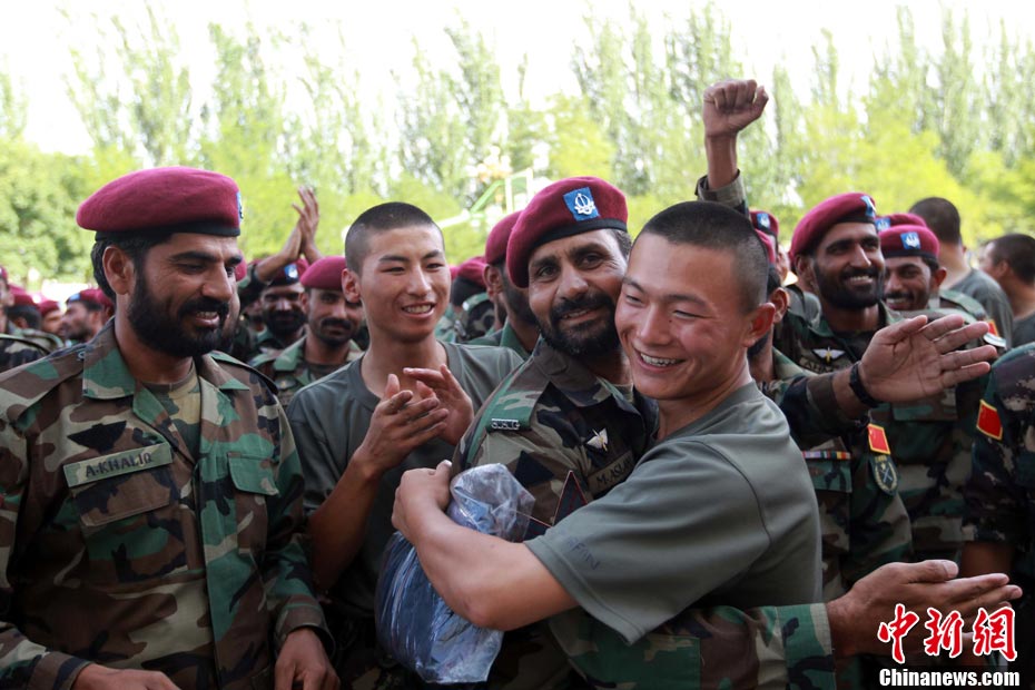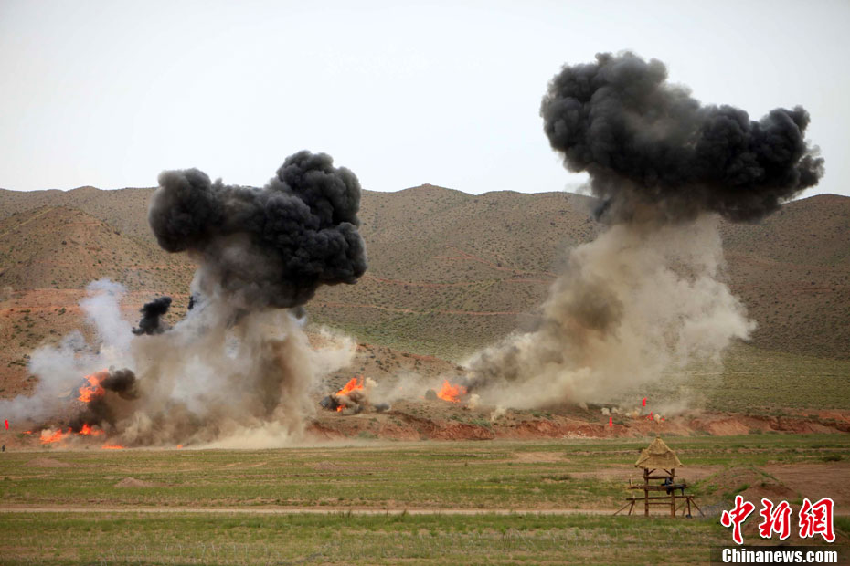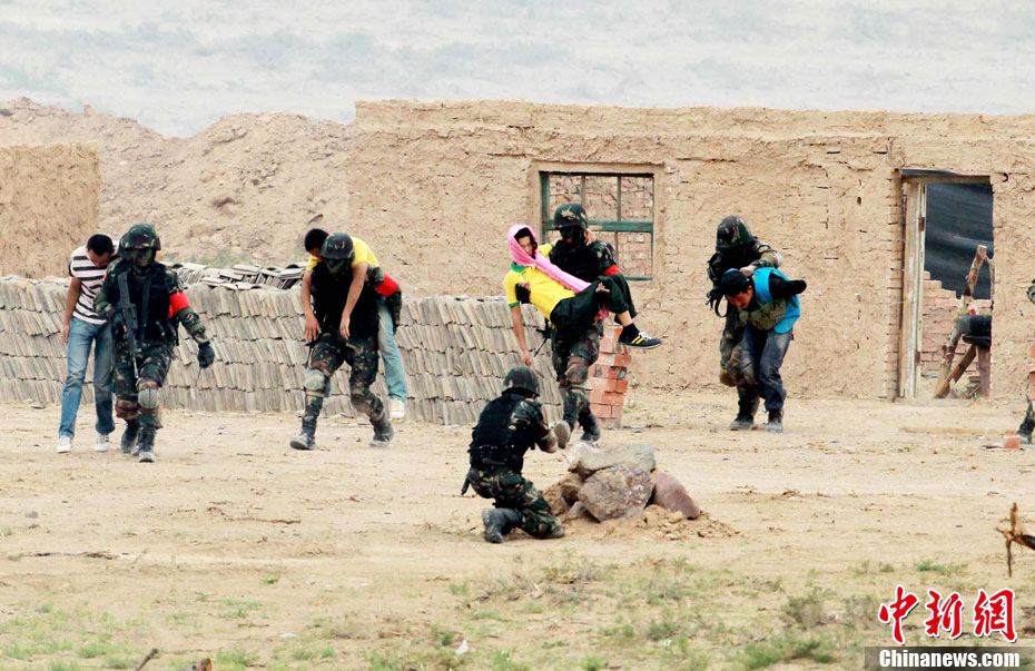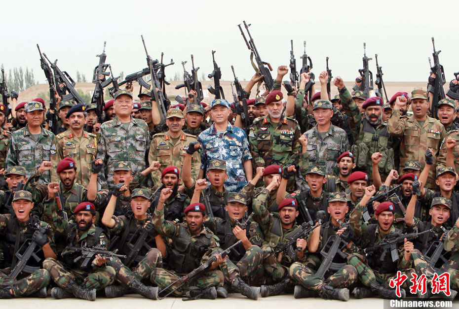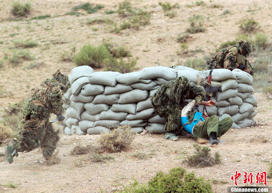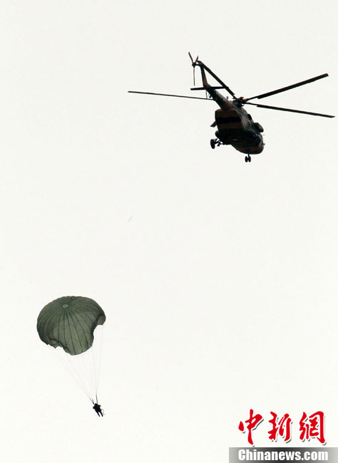 7月9日,友誼-2010”中巴反恐聯(lián)訓(xùn)在蘭州軍區(qū)某訓(xùn)練基地舉行實(shí)兵實(shí)彈演練,演練設(shè)計(jì)的背景是,對(duì)潛入中巴邊境地區(qū)實(shí)施襲擊破壞的國際恐怖分子進(jìn)行聯(lián)合打擊。圍繞“邊境地區(qū)山地聯(lián)合反恐作戰(zhàn)”這一課題,演練了遠(yuǎn)程投送、偵察監(jiān)視、立體封控、精確打擊、解救人質(zhì)、搜剿圍殲6個(gè)行動(dòng)。這次反恐聯(lián)演的一個(gè)亮點(diǎn),就是首次空地協(xié)同,聯(lián)合打擊,由地面反恐特戰(zhàn)人員引導(dǎo)殲轟機(jī)、武裝直升機(jī)實(shí)施空中火力突擊,采取精打要害的戰(zhàn)法,以建制內(nèi)的火器對(duì)恐怖分子營地重要目標(biāo)實(shí)施火力打擊。中新社發(fā) 杜洋 攝