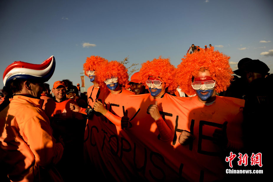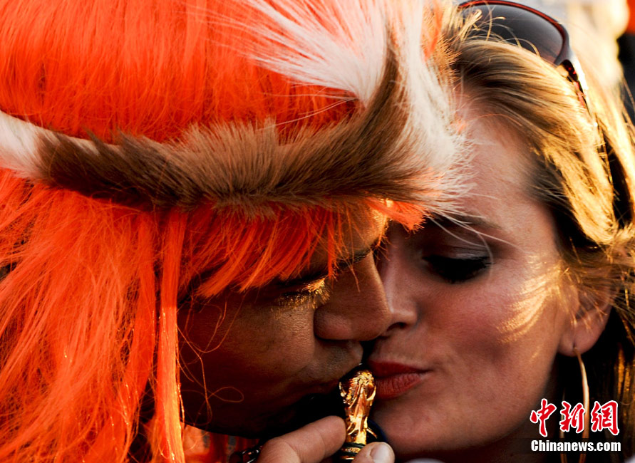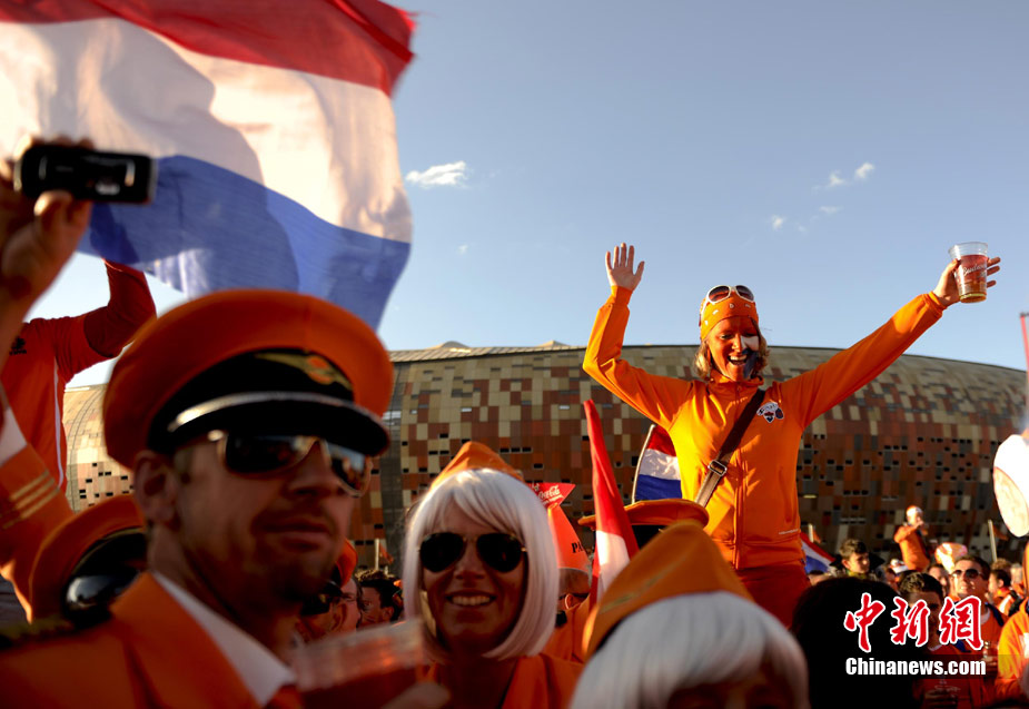 7月11日,南非約翰內(nèi)斯堡足球城,眾多荷蘭球迷在足球城球場(chǎng)外激情舞蹈。當(dāng)晚,南非世界杯荷蘭對(duì)西班牙的決賽將在足球城球場(chǎng)舉行。中新社記者 廖攀 攝