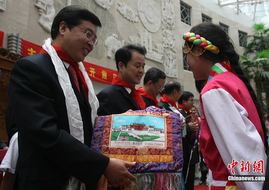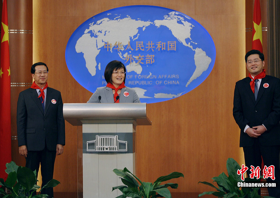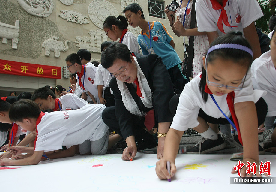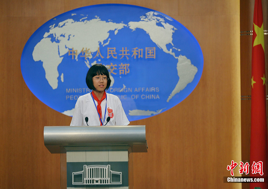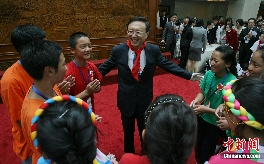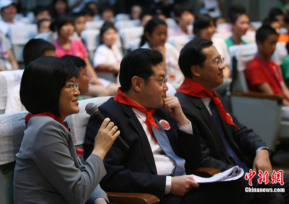 7月17日,在外交部橄欖廳,外交部長楊潔篪勉勵(lì)玉樹震區(qū)小學(xué)生努力學(xué)習(xí)、重建家園。當(dāng)日,外交部舉辦第八次駐外使節(jié)任職宣誓儀式暨外交部“祖國在我心中”主題公眾開放日。來自北京、玉樹、黑龍江、重慶等地的小學(xué)生參加了此次活動(dòng)。中新社發(fā) 蘇丹 攝