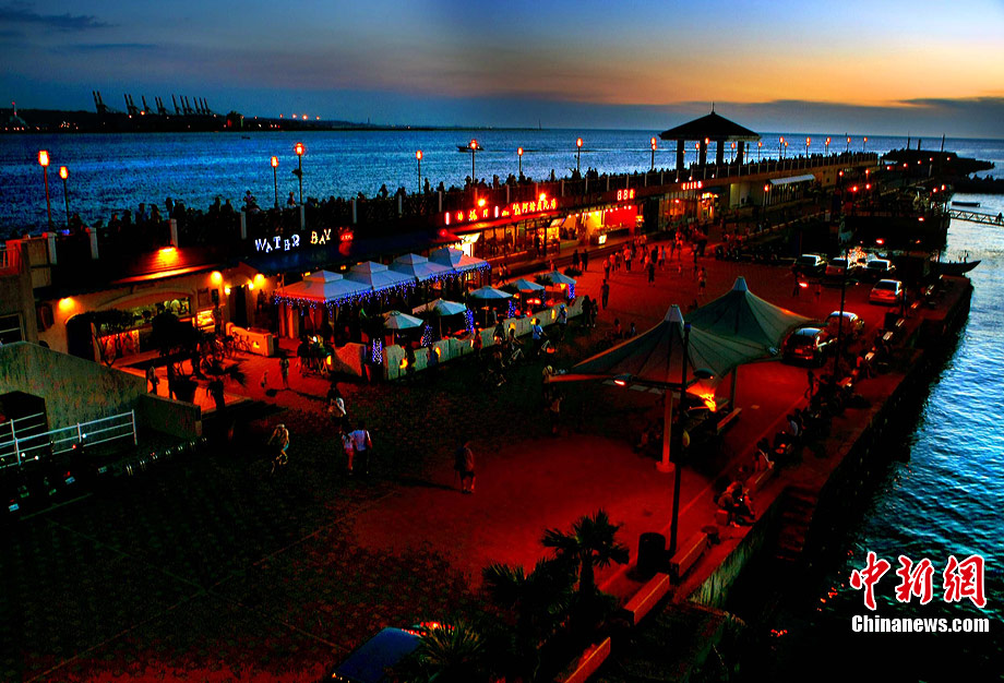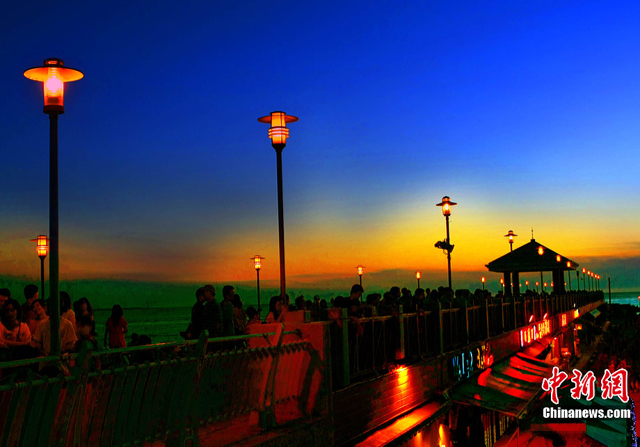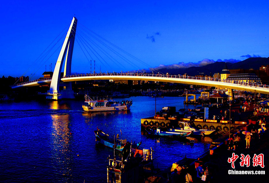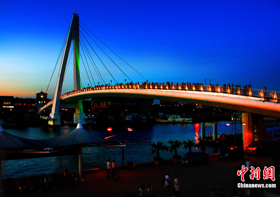 進(jìn)入7月中下旬的臺灣淡水漁人碼頭,游人如織,黃昏時下,晚霞照碼頭,漁船燈火明,景色迷人。據(jù)悉,淡水漁人碼頭,之前為淡水第二漁港,情人橋完工后,完善成為觀光休閑碼頭。中新社記者 宋吉河 攝