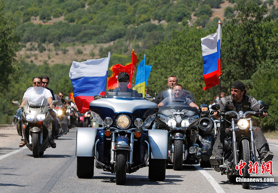 當(dāng)?shù)貢r間7月24日,在烏克蘭塞瓦斯托波爾,俄羅斯總理普京駕駛一輛哈雷摩托車前往一個俄羅斯和烏克蘭摩托車愛好者的聚會營地參加活動。
