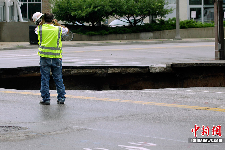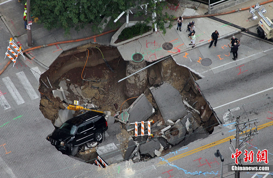 美國(guó)遭暴雨襲擊 汽車掉入“天坑”