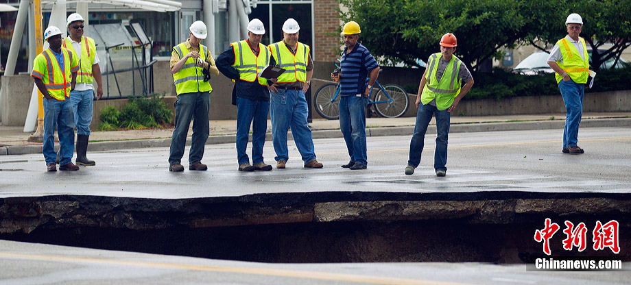 當(dāng)?shù)貢r(shí)間7月23日,美國(guó)南部威斯康星州遭遇強(qiáng)烈暴風(fēng)雨襲擊,造成當(dāng)?shù)亟值赖孛嫠莩霈F(xiàn)大洞,路過的汽車不慎掉入洞中。暴風(fēng)雨還造成當(dāng)?shù)囟嗵幒樗簽E。