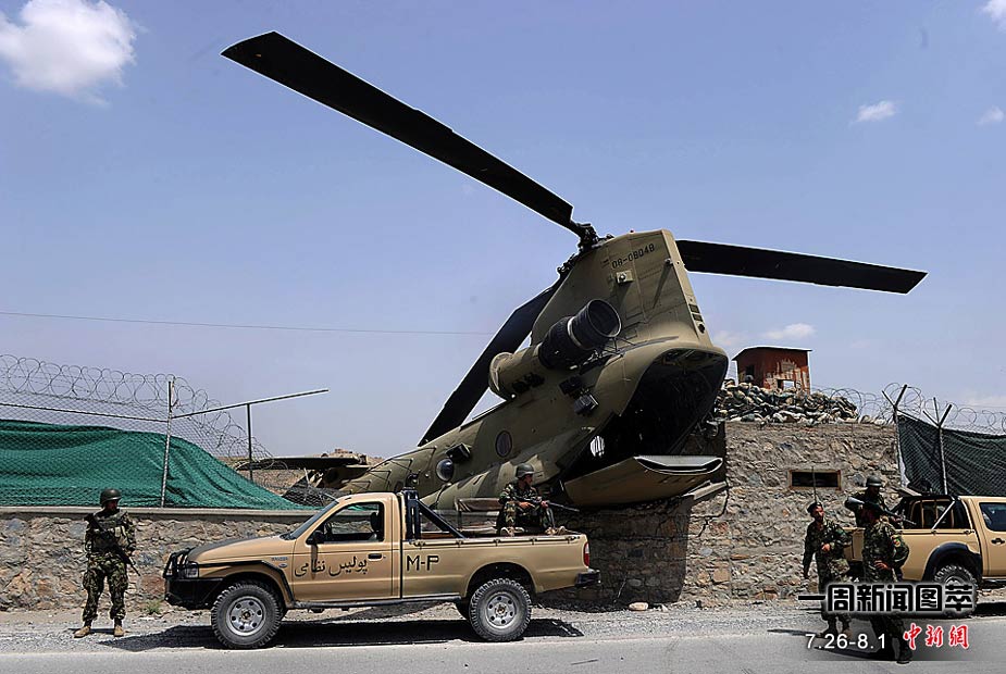 7月26日(周一),駐阿富汗國際安全援助部隊(duì)的一架“支奴干”直升機(jī)在喀布爾東部地區(qū)墜毀。圖為阿富汗國民軍士兵們正守在墜毀的直升機(jī)旁。機(jī)上四名成員只受了輕傷,飛機(jī)墜毀的原因正在調(diào)查中。