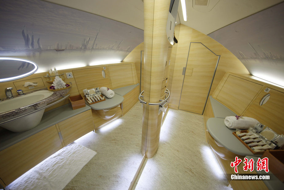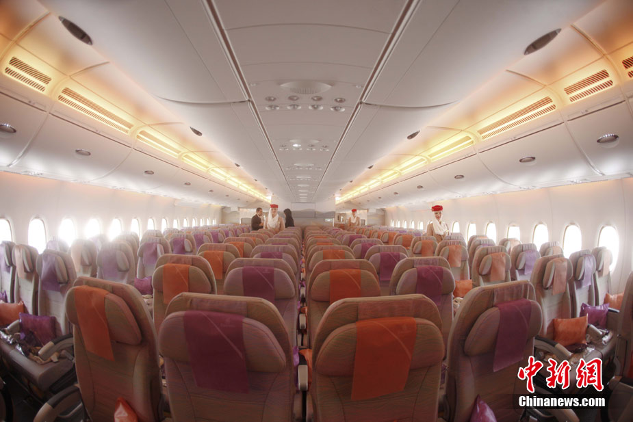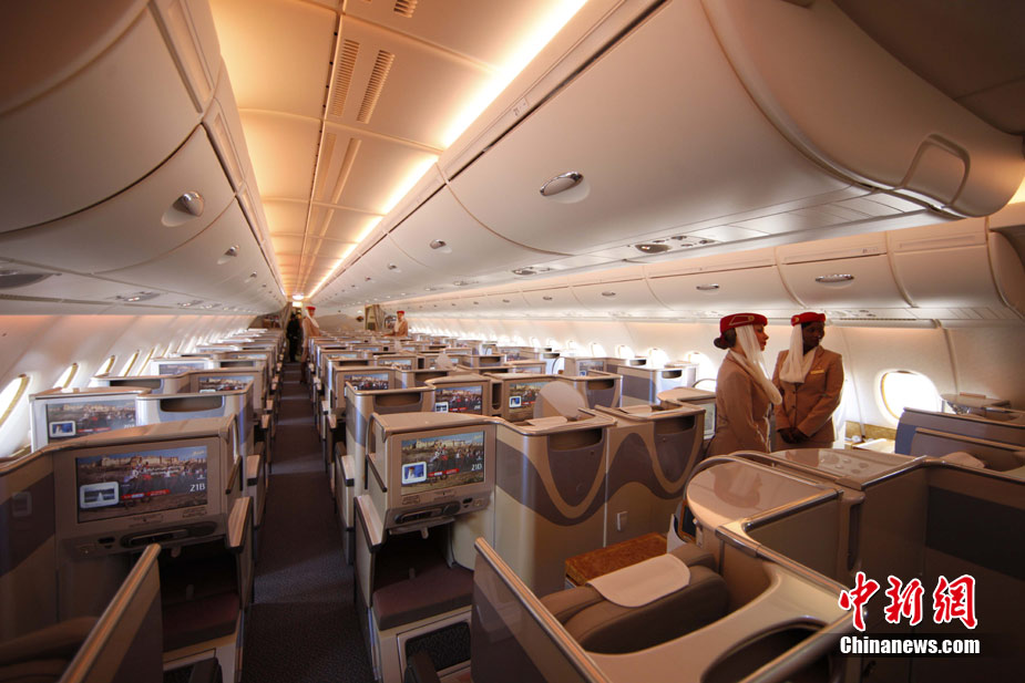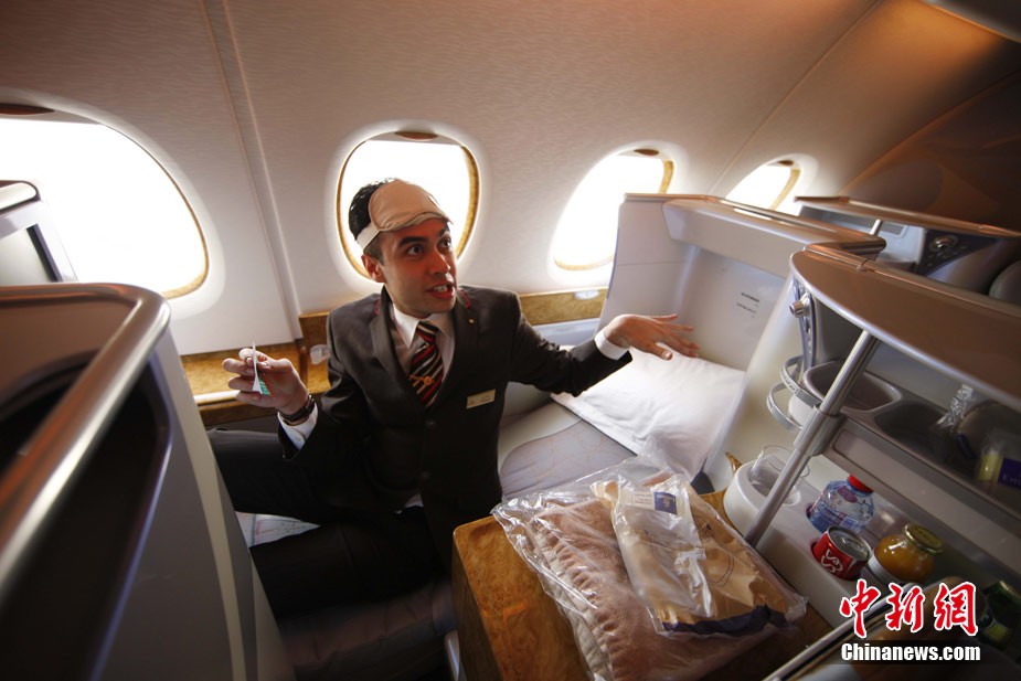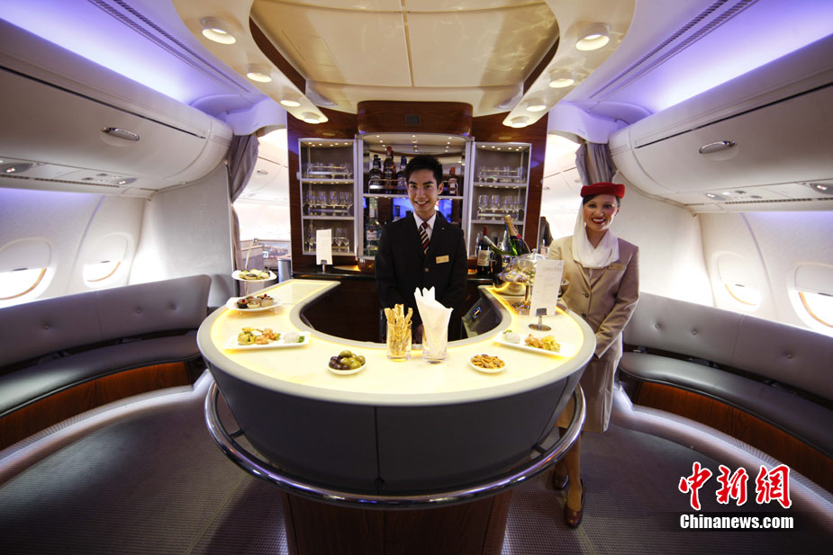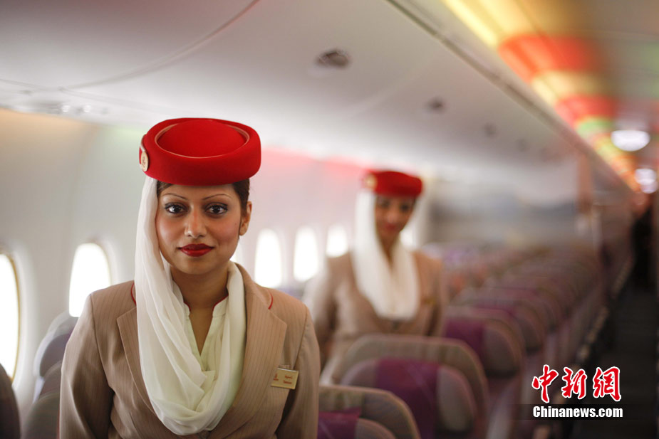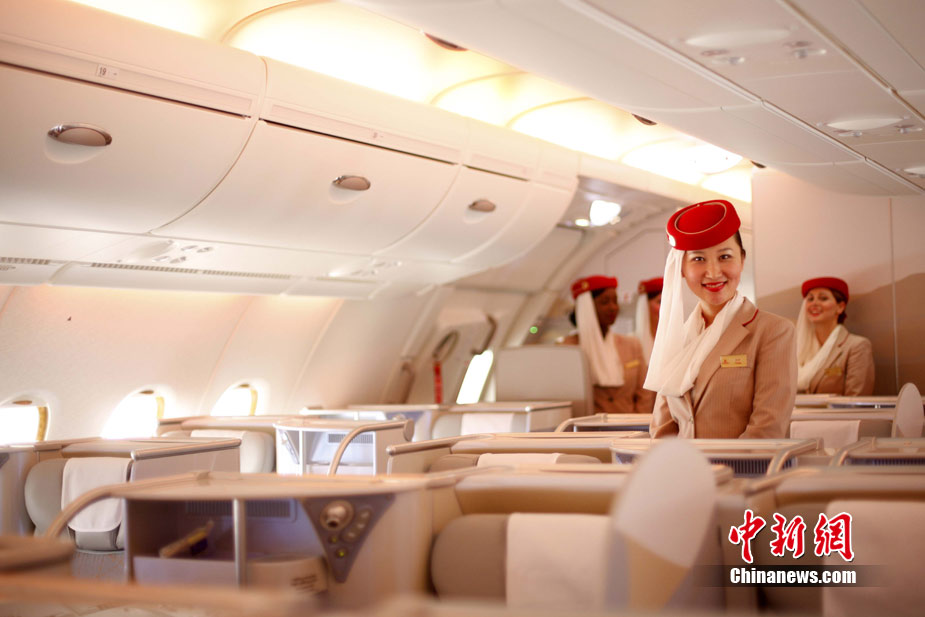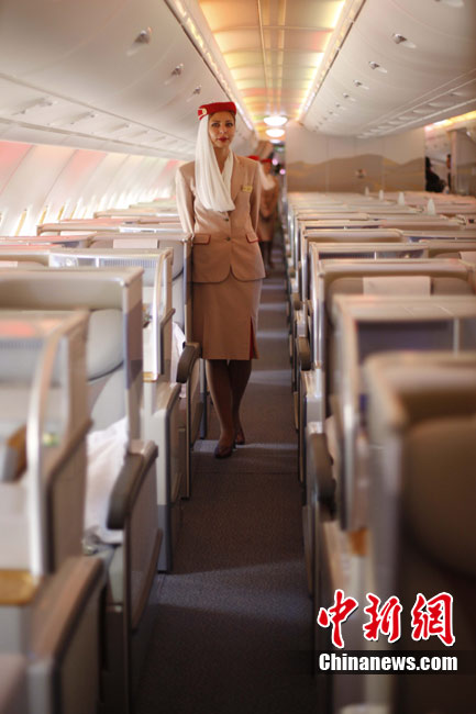 阿航A380 客機(jī)頭等艙內(nèi)共有14個(gè)私人套間,設(shè)有兩間設(shè)備齊全的淋浴房,帶按摩功能的座椅可平躺成床。頭等艙和商務(wù)艙乘客還能享受如私人會(huì)所般、提供冷熱小點(diǎn)和酒品飲料的機(jī)上酒廊社交區(qū)。商務(wù)艙的座椅可放平成2米長(zhǎng)的床,而經(jīng)濟(jì)艙的座椅可以傾斜多達(dá)33英寸,讓乘客自由舒展身體。所有艙位的乘客都可以享用阿航多達(dá)1200個(gè)頻道的數(shù)碼寬屏機(jī)上娛樂(lè)系統(tǒng),該系統(tǒng)提供空中娛樂(lè)節(jié)目。圖為阿聯(lián)酋航空空客A380上的空姐。中新社記者 盛佳鵬 攝