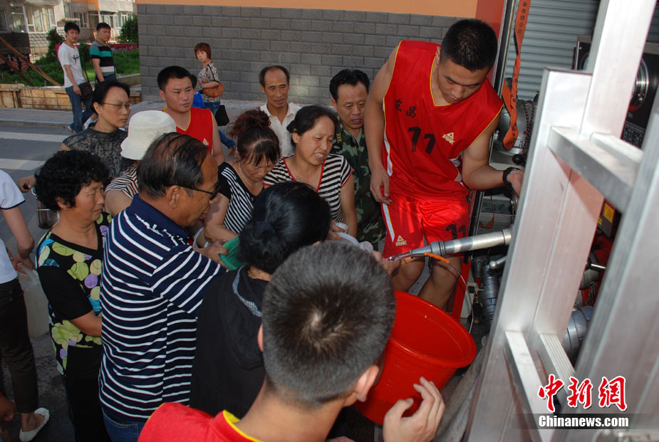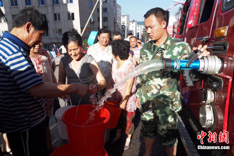 從7月31日吉林通化市內(nèi)全部供水管線被洪水沖毀到現(xiàn)在,33萬居民斷水時間已經(jīng)超過60小時。 8月3日通化市派出消防車輛給居民運送生活用水的工作仍將繼續(xù),時間有望從早5點到晚六點延長到晚8點,送水量也不會少于180臺次、1700噸水。同時,當?shù)匦l(wèi)生防疫部門對使用自用水的飯店進行了嚴格監(jiān)督、檢查和登記,目前,沒有發(fā)現(xiàn)水質問題,也沒有食物中毒現(xiàn)象發(fā)生。中新社發(fā) 王孝偉 攝 來源:CNSPHOTO