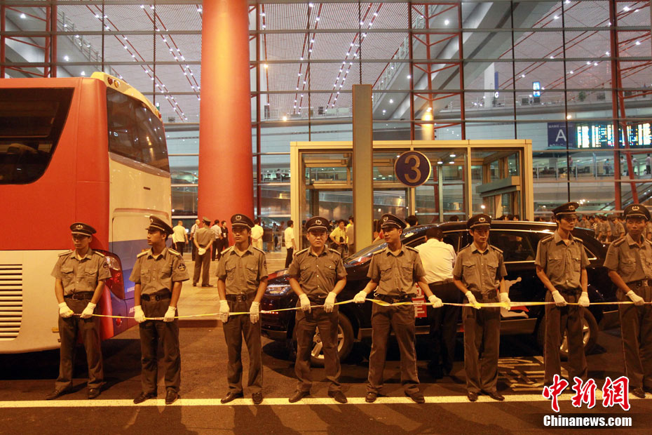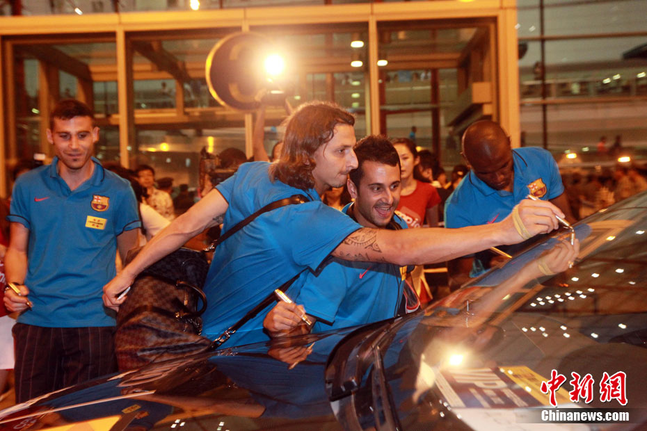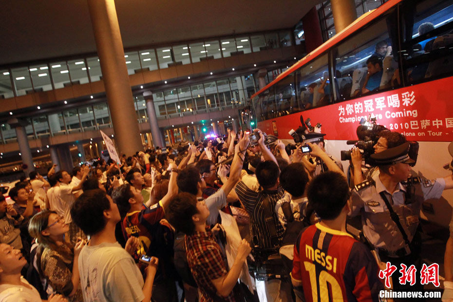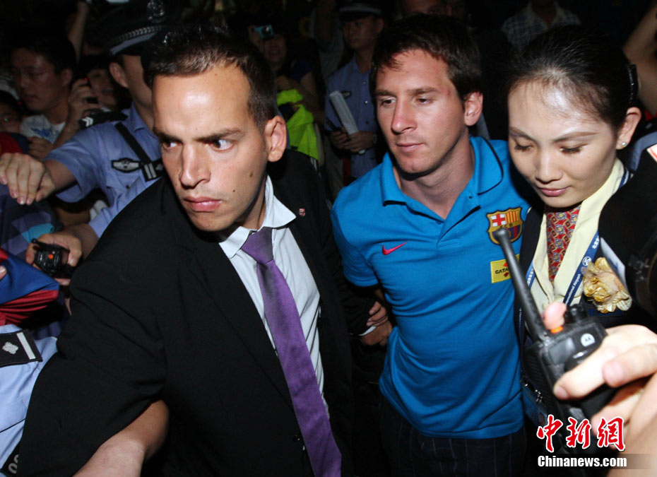 8月5日凌晨,巴薩全隊乘機從首爾飛抵北京,在首都國際機場的T3航站樓,西甲冠軍受到了數(shù)百名中國球迷的熱烈歡迎。梅西和伊布的到來,讓深夜的首都機場處于一片沸騰之中。圖為梅西艱難突出重圍。 中新社發(fā) 杜洋 攝