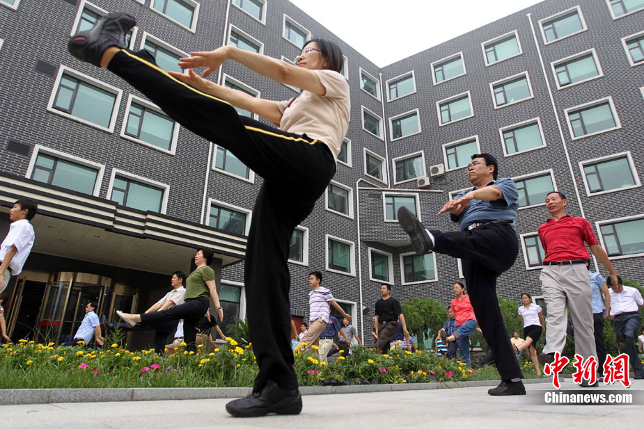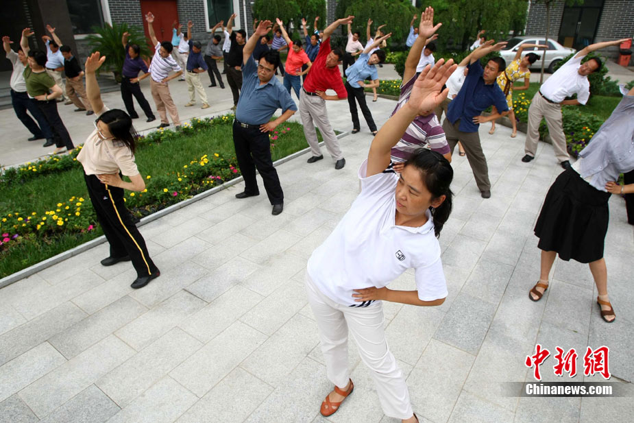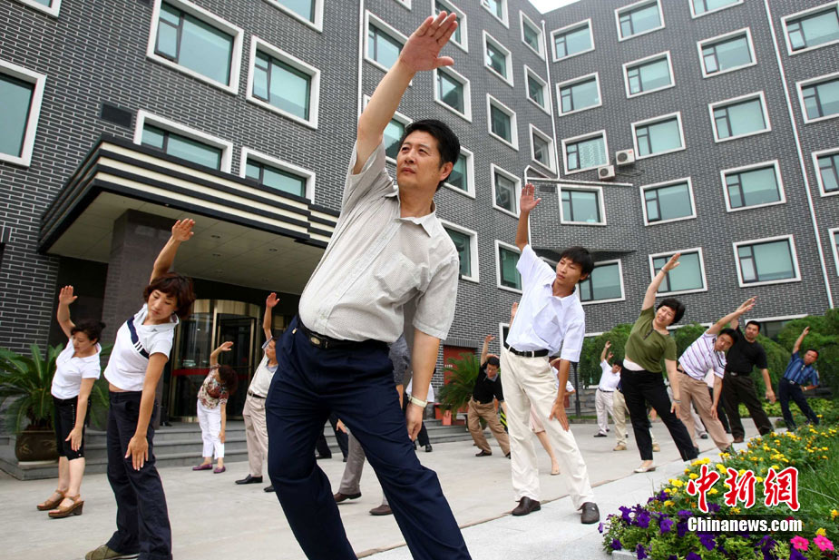 8月9日,北京化工集團(tuán)的職工在工間時(shí)段集體做廣播體操。當(dāng)日,北京恢復(fù)廣播體操,電臺(tái)在每天10時(shí)和15時(shí)連續(xù)播放兩次第八套廣播體操音樂,時(shí)長(zhǎng)為8分鐘左右。此次,北京市總工會(huì)定下目標(biāo),2011年全市職工參與健身活動(dòng)比例要達(dá)到60%以上,國(guó)有企業(yè)參與工間或工前操活動(dòng)要達(dá)到100%,機(jī)關(guān)事業(yè)單位要達(dá)到70%。中新社發(fā) 富田 攝
