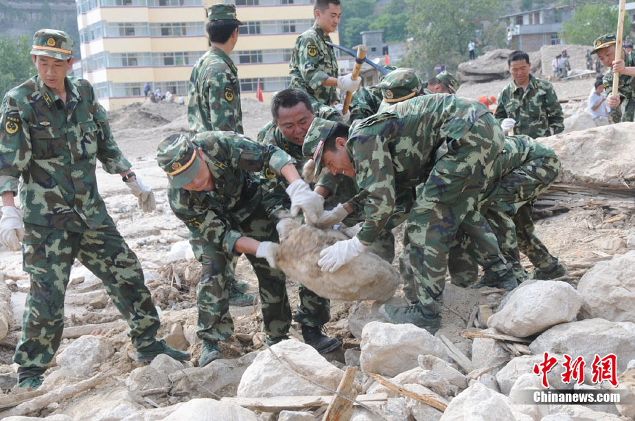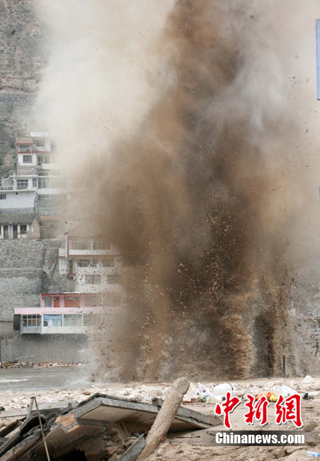 8月10日,蘭州軍區(qū)某集團軍“開山斧工兵團”兩次對舟曲災區(qū)堰塞湖實施爆破,雖然通過爆破,使河道基本疏通,但效果還不太明顯。11日,蘭州軍區(qū)工兵連將繼續(xù)爆破,使用炸藥重量也將提高。中新社發(fā) 劉忠俊 攝