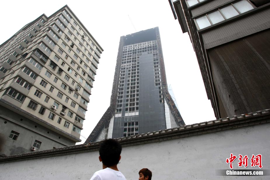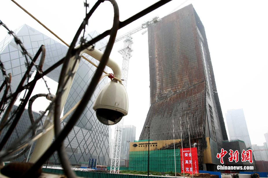 8月11日,中央電視臺電視文化中心工程(北配樓)拆卸復(fù)建施工正式啟動。據(jù)了解,當日啟動的是金屬幕墻和網(wǎng)架的拆卸。由于主題結(jié)構(gòu)未受到嚴重影響,因此復(fù)建后的大樓將基本保持“原樣”。這標志著2009年2月9日中央電視臺大火一年多后,央視新址北配樓終于正式進入拆卸復(fù)建階段。中新社發(fā) 富田 攝