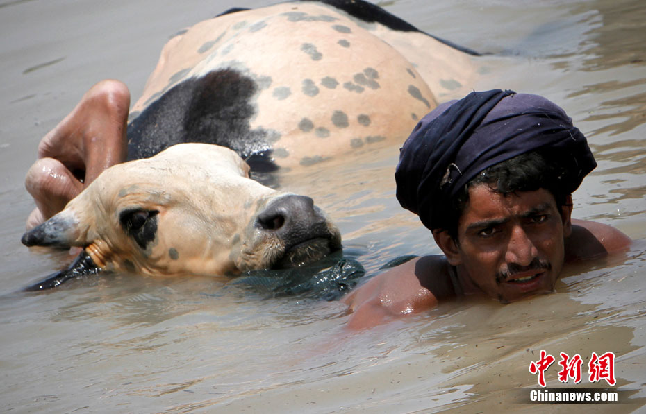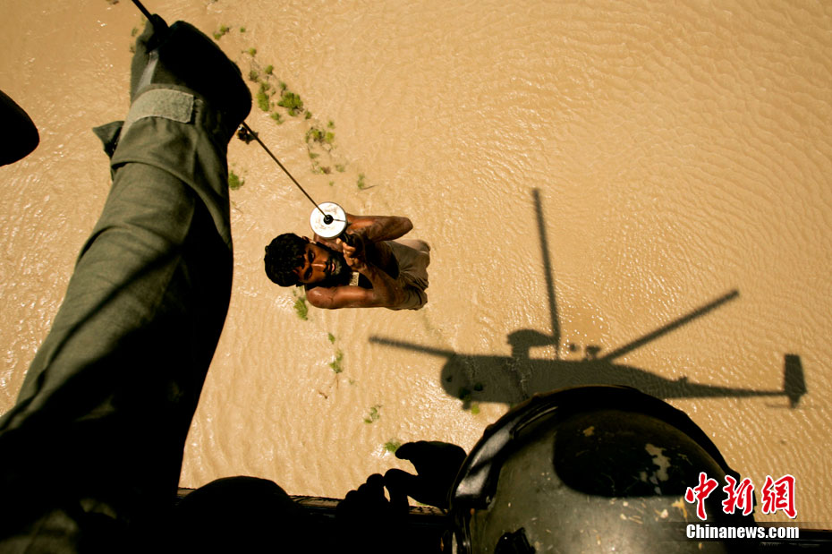 8月11日,巴基斯坦,洪水進(jìn)入信德省中部,一位災(zāi)民被救上直升飛機(jī)。7月下旬以來,巴基斯坦遭遇自1929年以來最嚴(yán)重的洪澇災(zāi)害。據(jù)估計,洪災(zāi)影響到該國從北到南的廣大區(qū)域,已導(dǎo)致1200多人喪生,1400多萬人受到影響。