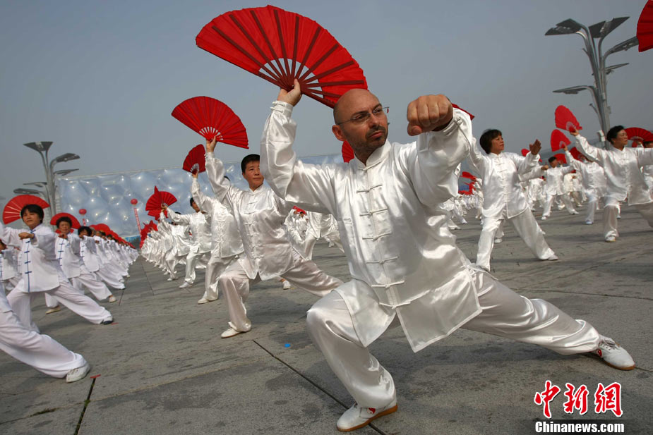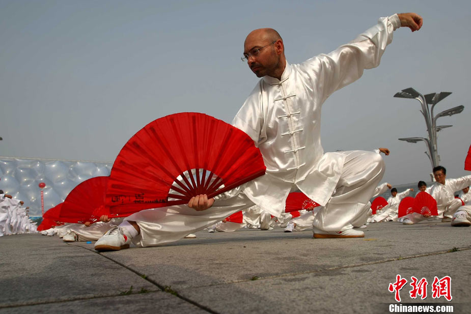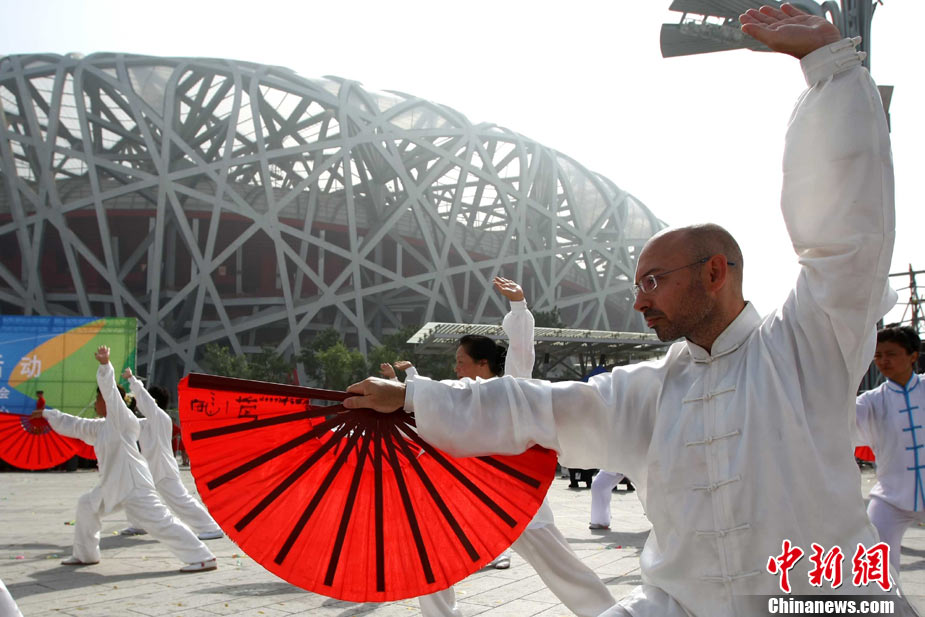 8月14日,為慶祝8月8日全民健身日和紀念北京奧運會舉辦兩周年,“北京奧運城市體育文化節(jié)--萬人健身氣功展示活動”在北京奧林匹克公園景觀大道舉行,近萬名中外民眾展示了五禽戲、八段錦和太極功夫扇三段健身氣功。圖為來自西班牙的中國氣功愛好者卡洛斯參與展示,他從2006年開始每年都要來中國三個月專心學習中國氣功。中新社發(fā) 富田 攝