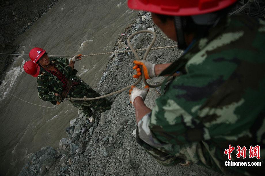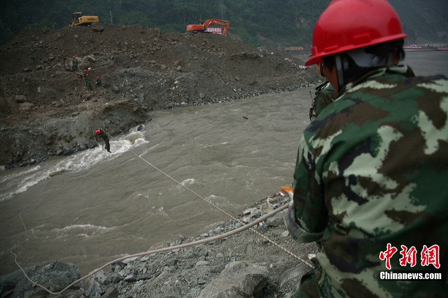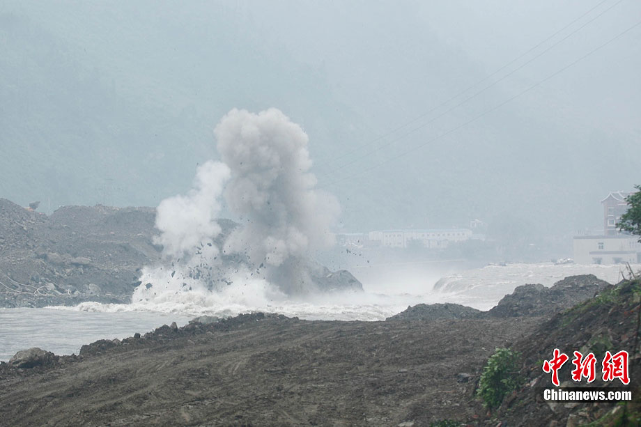 8月17日下午,映秀泥石流搶險救災(zāi)指揮部對致使岷江改道的堰塞體進行了第二次爆破,由于天氣不甚理想,為了盡快實現(xiàn)岷江河水“回軌”,救援指揮部決定以爆破的方式加快搶險進度。據(jù)爆破現(xiàn)場負責人透露,此次爆破主要是為解決8塊巨石,這些巨石超出了挖掘機的負荷量,必須選擇爆破方式解決。中新社發(fā) 張浪 攝