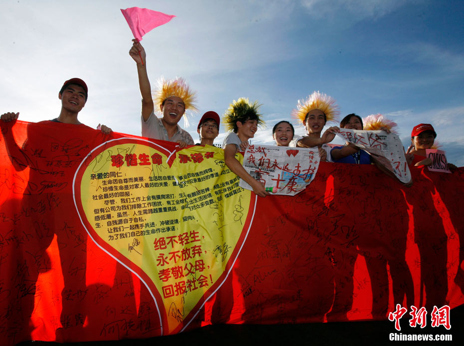 8月18日下午,深圳市富士康廠區(qū),舉行了一場由富士康員工自發(fā)倡議、富士康工會聯(lián)合會組織的規(guī)?涨暗娜f人誓師活動,活動的主題是“珍惜生命,關(guān)愛家人”,2萬員工跟著一輛輛彩車歡聲笑語,員工們說這是他們的“狂歡節(jié)”。