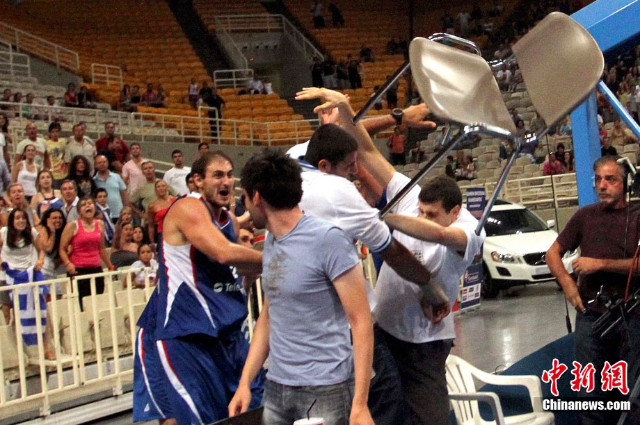 8月19日,在希臘舉行的雅典衛(wèi)城籃球四國賽中,塞爾維亞隊與希臘隊爆發(fā)沖突,裁判提前宣布比賽結(jié)束。圖為塞爾維亞隊球員克爾斯蒂奇(左)將椅子扔向希臘隊球員布魯西斯。