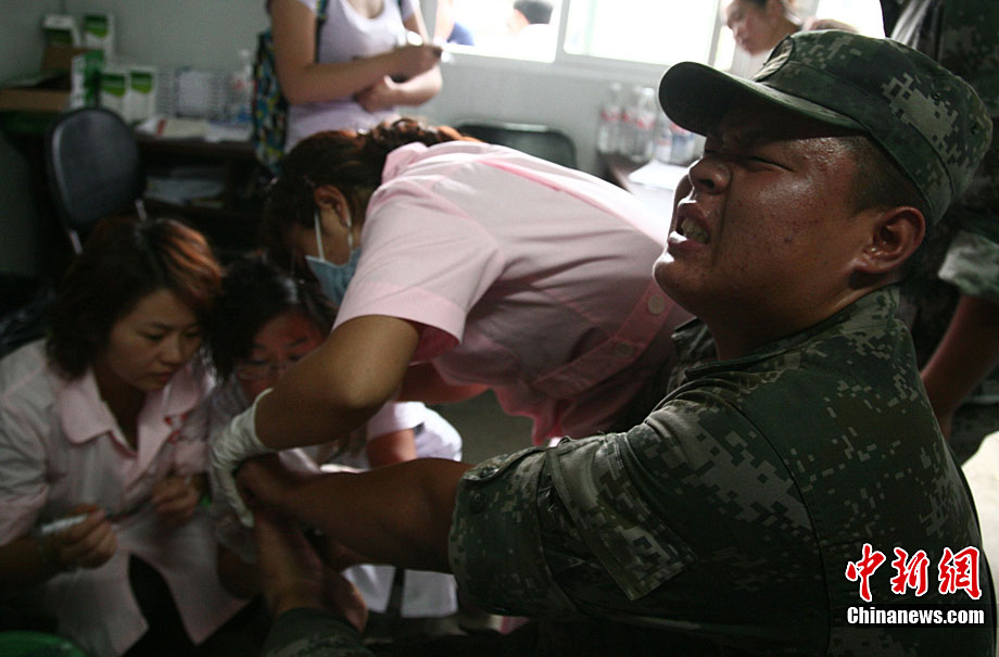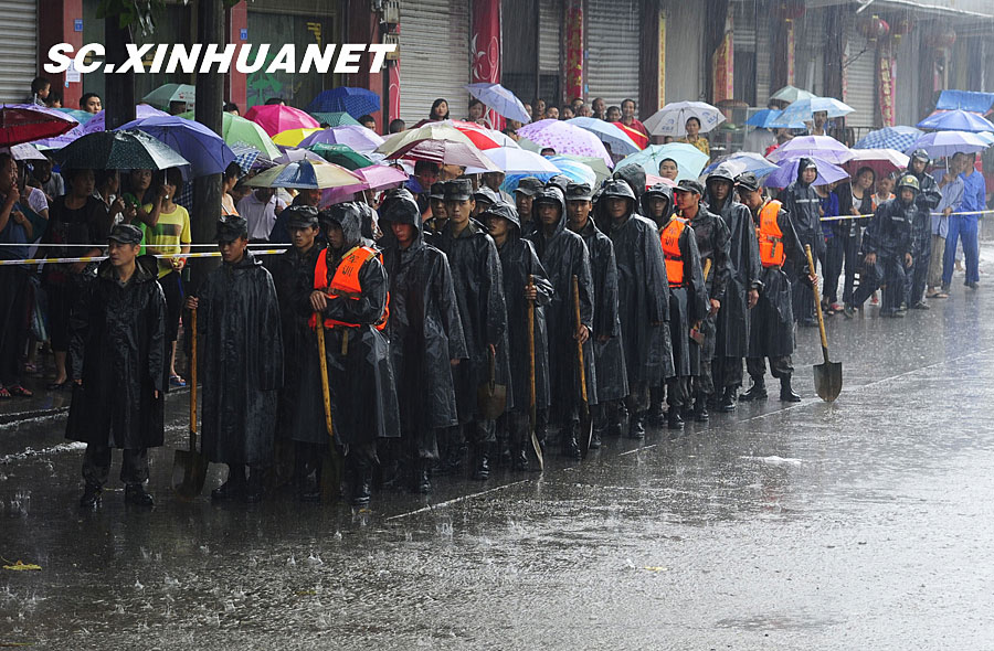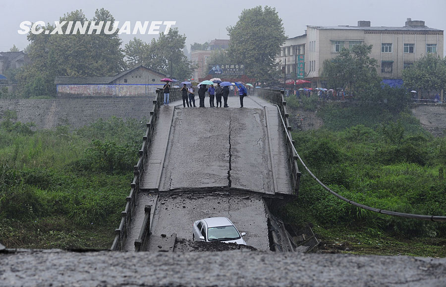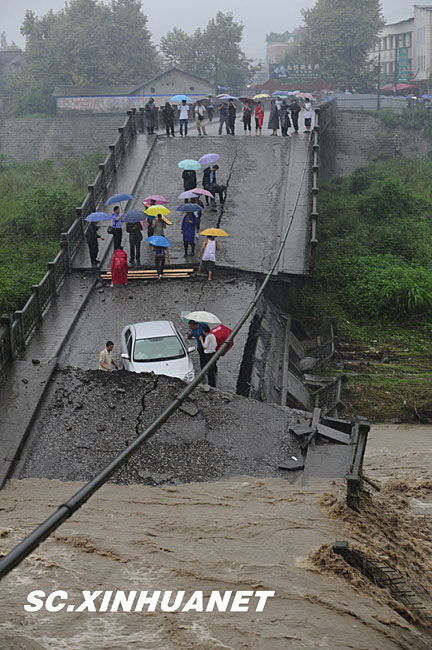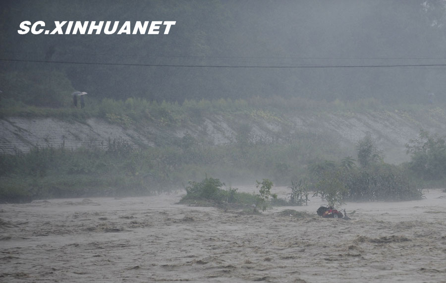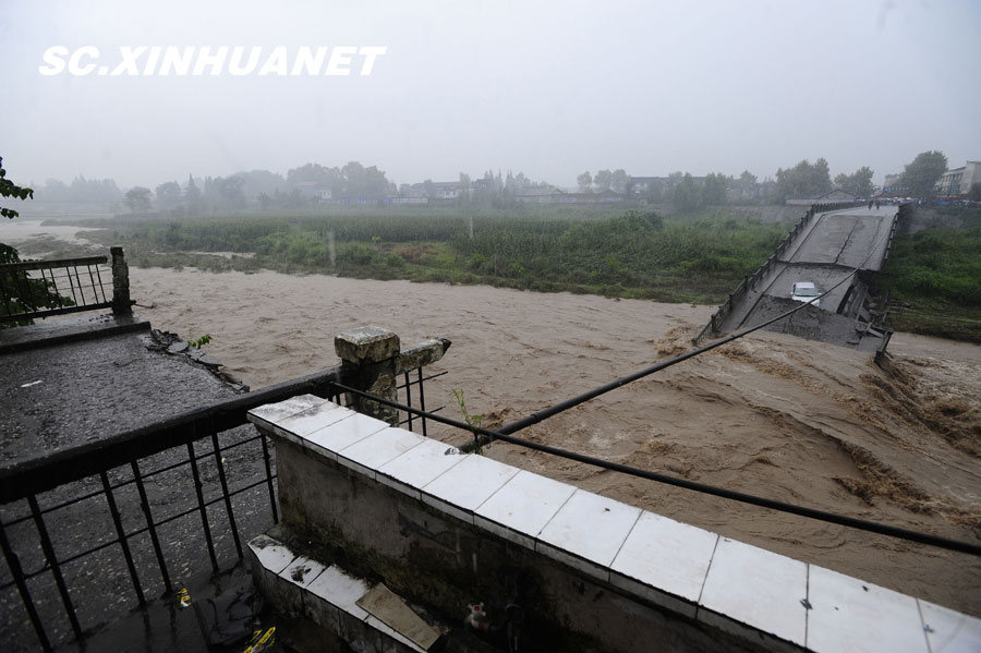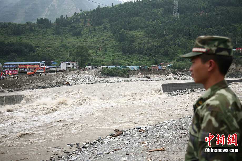 8月19日晚10時許,洪峰再次通過汶川縣映秀鎮(zhèn),突如其來的洪峰沖垮了映秀鎮(zhèn)堰塞體旁的防護欄,造成該段岷江水位下降,湍急的水流轉(zhuǎn)向沖刷映秀鎮(zhèn)新城河堤,搶險隊已用裝有石料的鐵絲網(wǎng)圍住河堤以保護映秀鎮(zhèn)新城。圖為已沖毀的岷江防護欄。中新社發(fā) 張浪 攝
