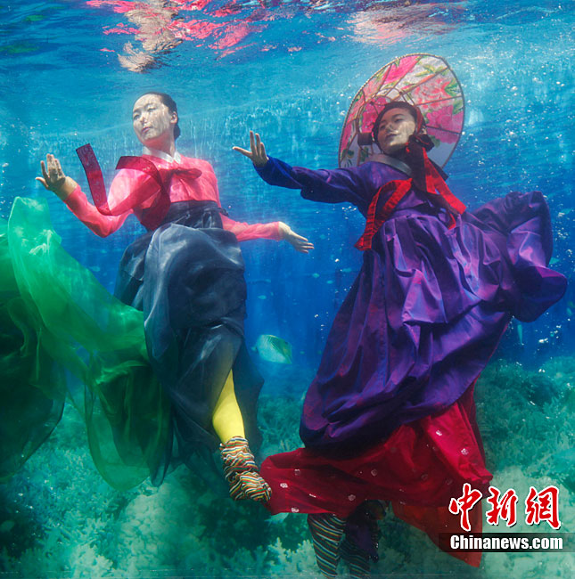 當?shù)貢r間8月22日,在韓國首都首爾舉辦的一場名為“水下韓服秀”的推廣活動中,多名身著韓服的潛水員在水族箱中為觀眾表演。