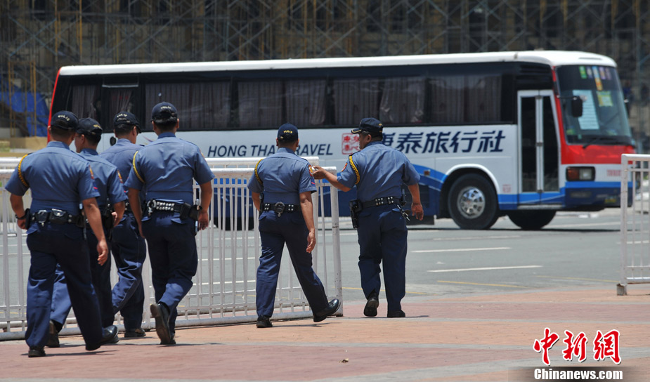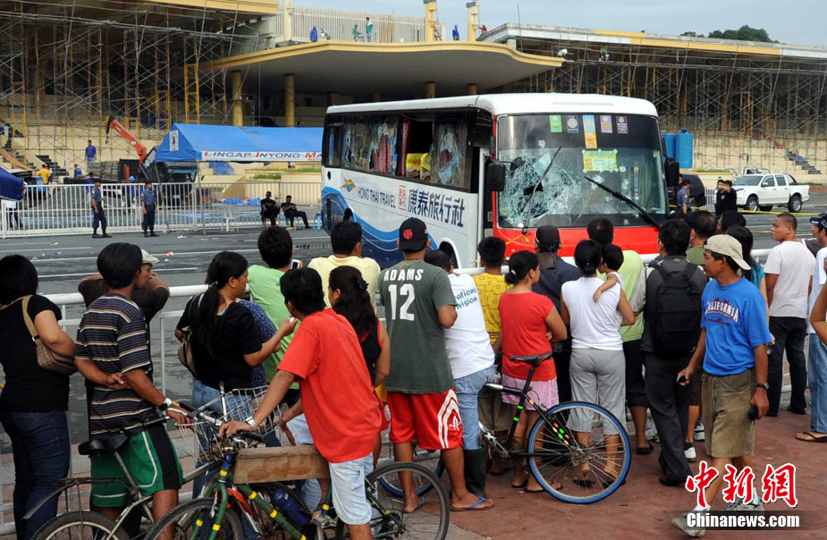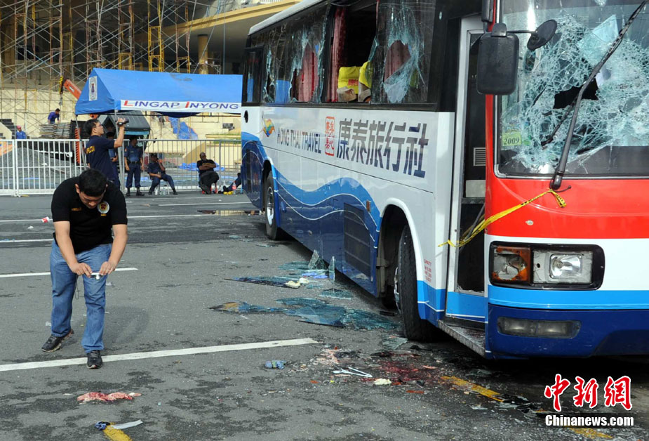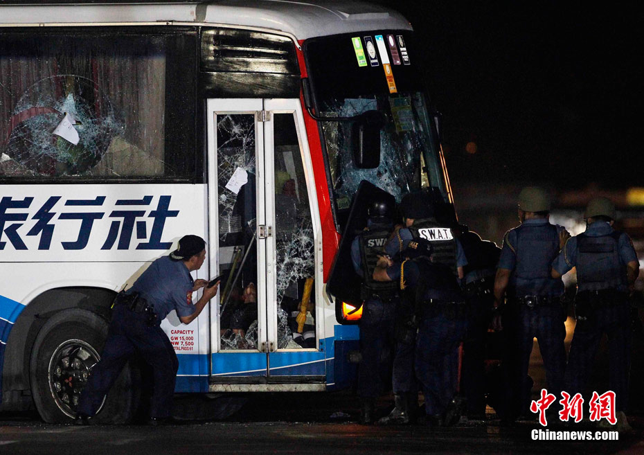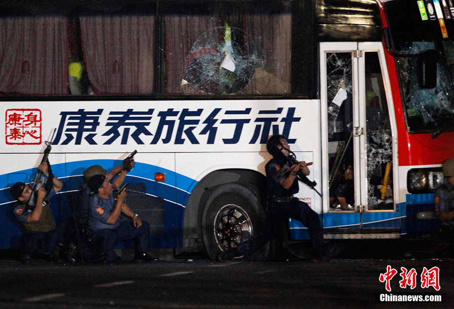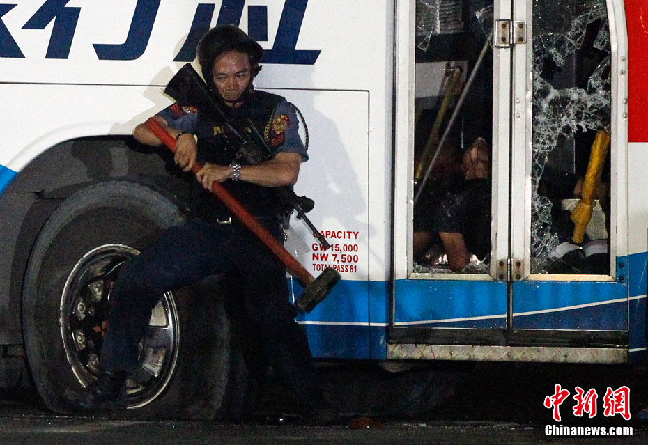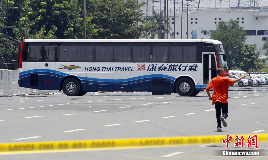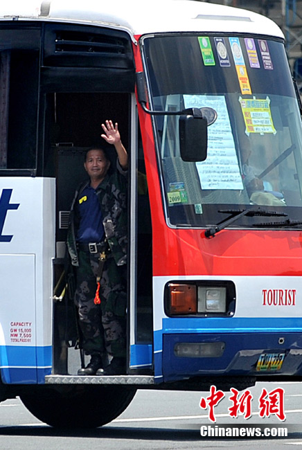 香港康泰旅行社23日證實,一個21人的香港旅行團(tuán)在菲律賓馬尼拉被劫持。旅行團(tuán)包括20名香港游客和1名香港領(lǐng)隊,其中有3名兒童。劫持者是一位被革職的警察。截止目前已有6名人質(zhì)獲釋,其中包括3名兒童。圖為劫持者站在被劫持的旅游觀光車門口。