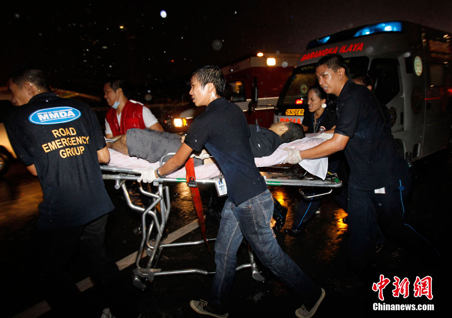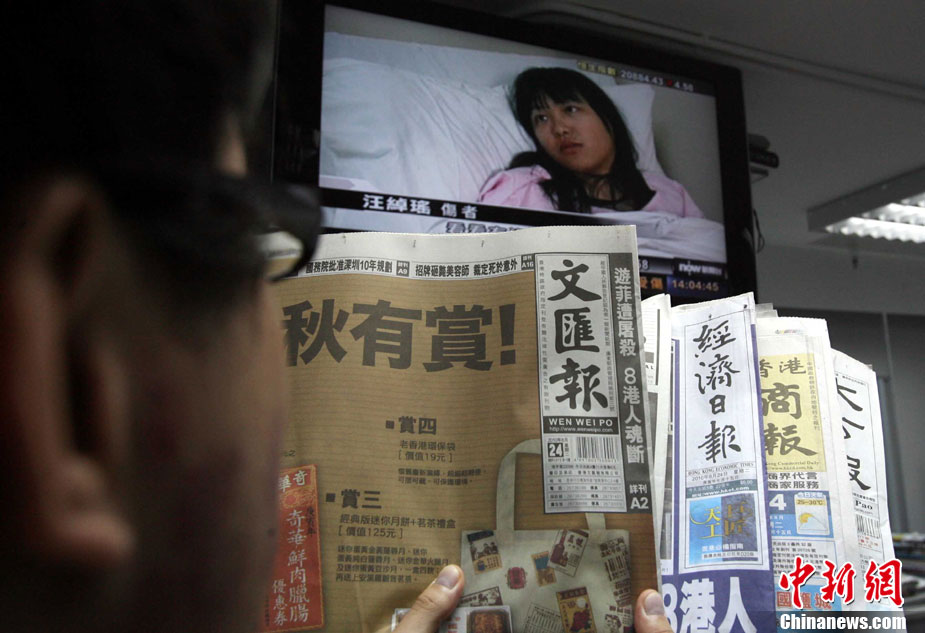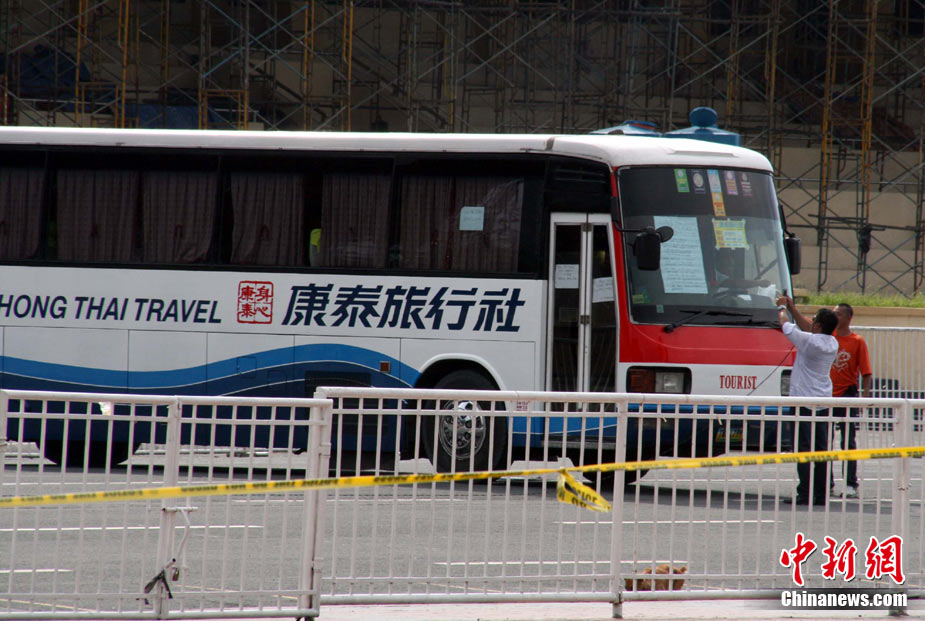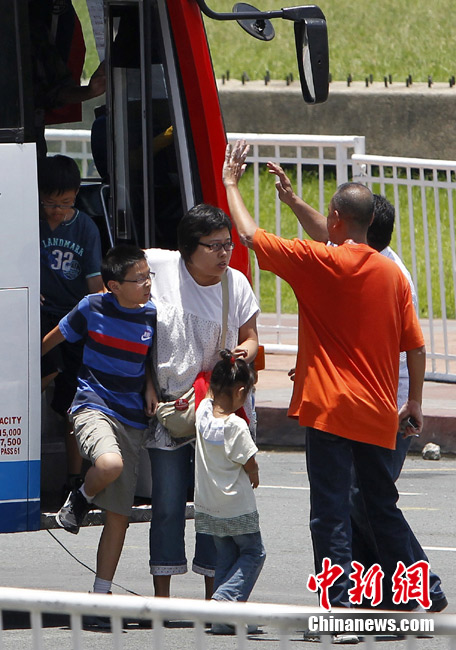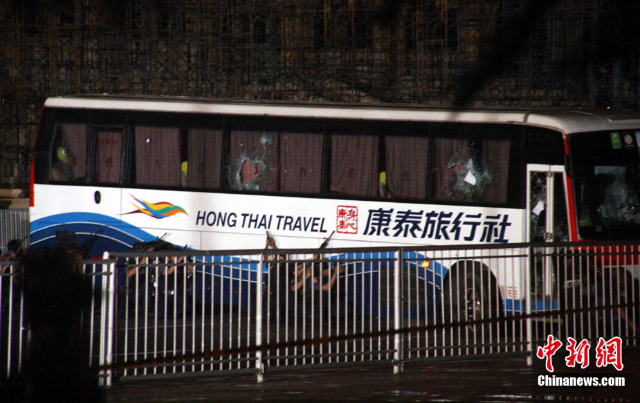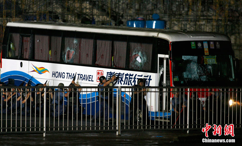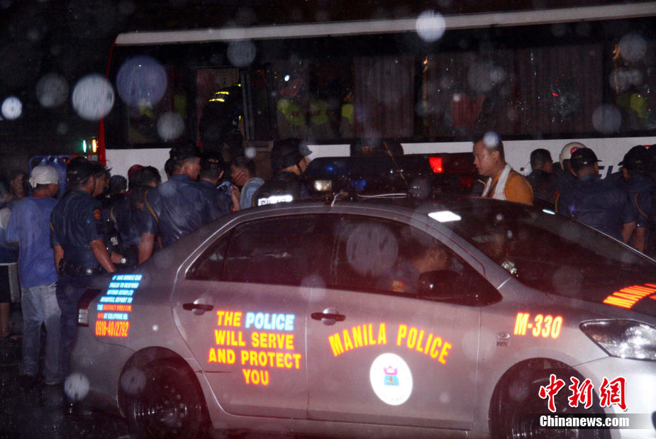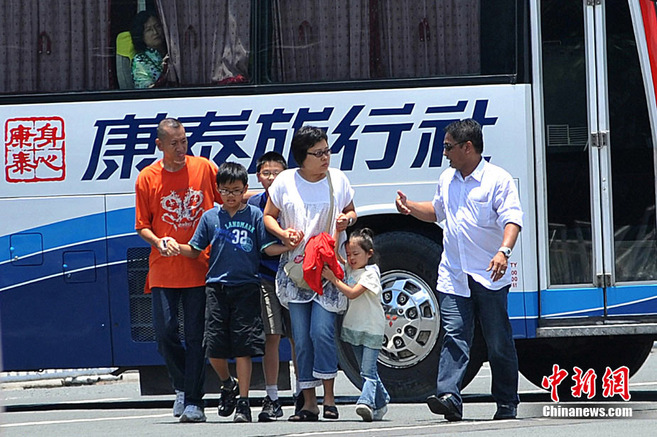 香港康泰旅行社23日證實,一個21人的香港旅行團(tuán)在菲律賓馬尼拉被劫持。旅行團(tuán)包括20名香港游客和1名香港領(lǐng)隊,其中有3名兒童。劫持者是一位被革職的警察。截止目前已有6名人質(zhì)獲釋,其中包括3名兒童。圖為劫持者站在被劫持的旅游觀光車門口。