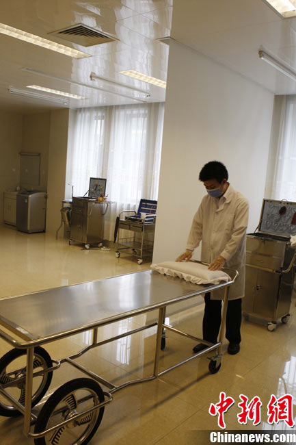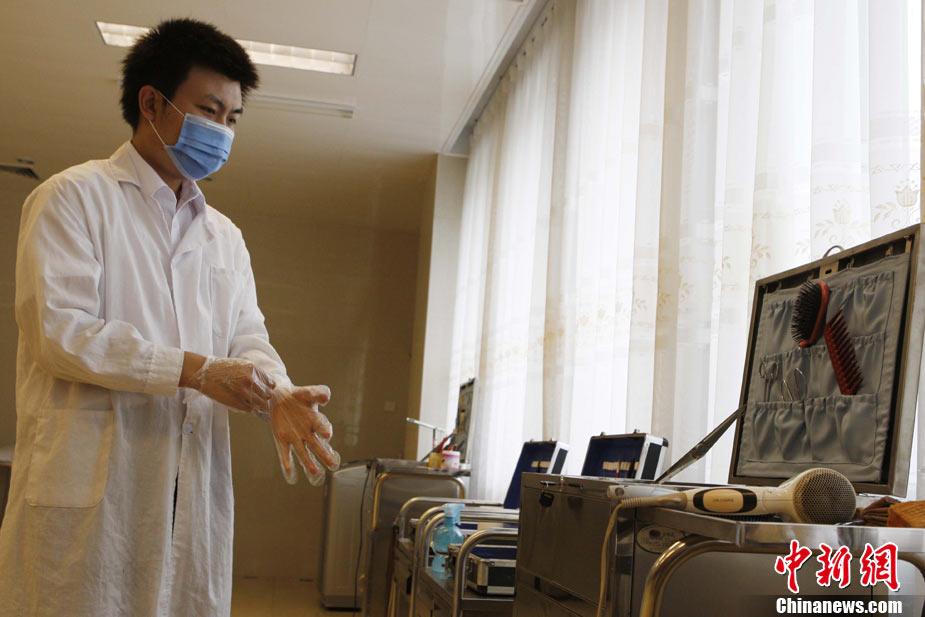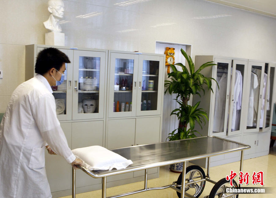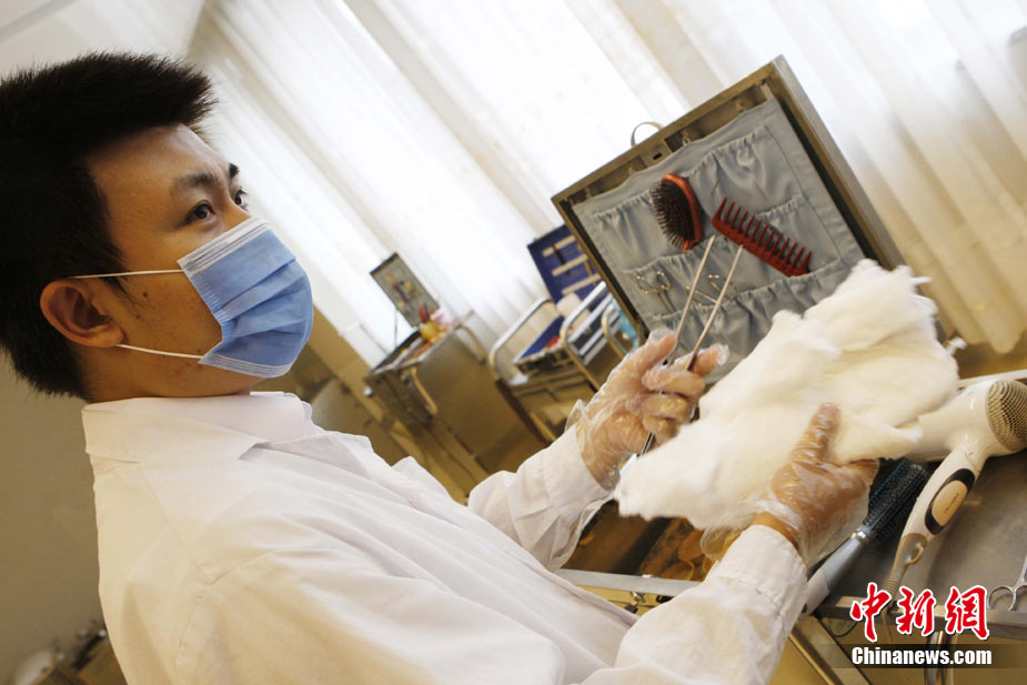 近期,北京團市委正在開展“探訪青年勞動者”活動。二十八歲的八寶山殯儀館整容師張洋便是其中之一。他自二〇〇五年進(jìn)入八寶山殯儀館工作以來,勤學(xué)苦練,刻苦鉆研,勇于創(chuàng)新,共為三千余位逝者提供了高質(zhì)量的整容服務(wù),圓滿完成了二零一零年八名駐海地維和人員不幸遇難后遺體整容工作等二十余次重大任務(wù)。在剛剛結(jié)束的全國民政行業(yè)職業(yè)技能競賽中奪得大賽一等獎第一名。中新社記者 任海霞 攝
