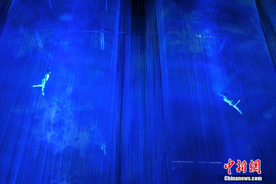 8月23日,北京武搏會(huì)開幕式彩排中,演員在由12.5萬根筷子粗細(xì)的腈綸線組成的“線陣”中表演。據(jù)了解,這是國內(nèi)首次使用“線陣”作為開幕式創(chuàng)意。 中新社發(fā) 蘇丹 攝
