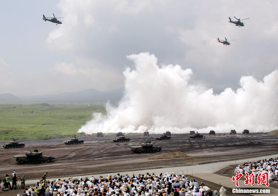 日本陸上自衛(wèi)隊(duì)24日開始在富士山下的靜岡縣御殿場市東富士演習(xí)場舉行2010年綜合火力演習(xí)。當(dāng)天的演習(xí)動(dòng)用了90式坦克、“阿帕奇”直升機(jī)等武器。2000多名官兵參加演習(xí)。