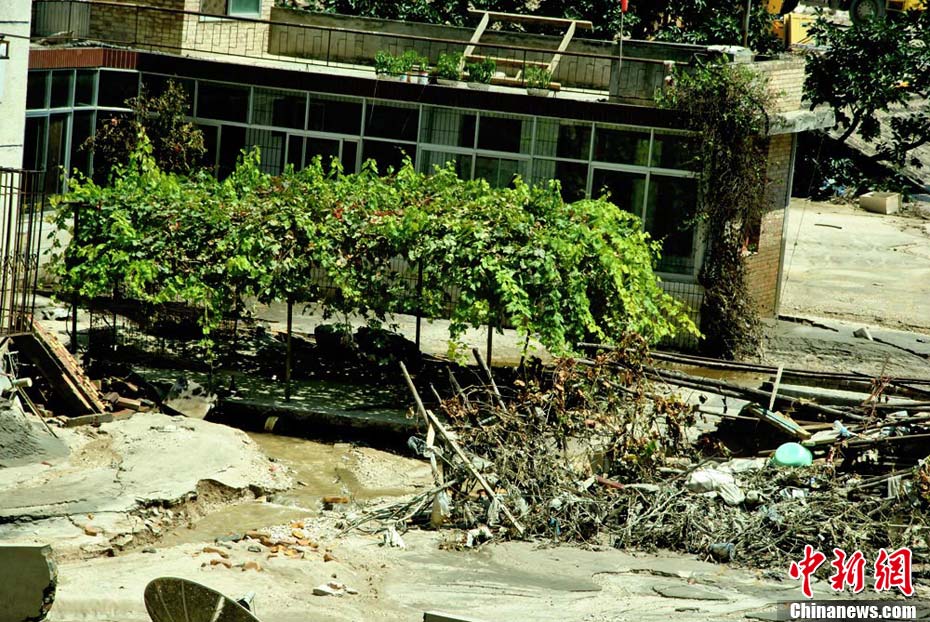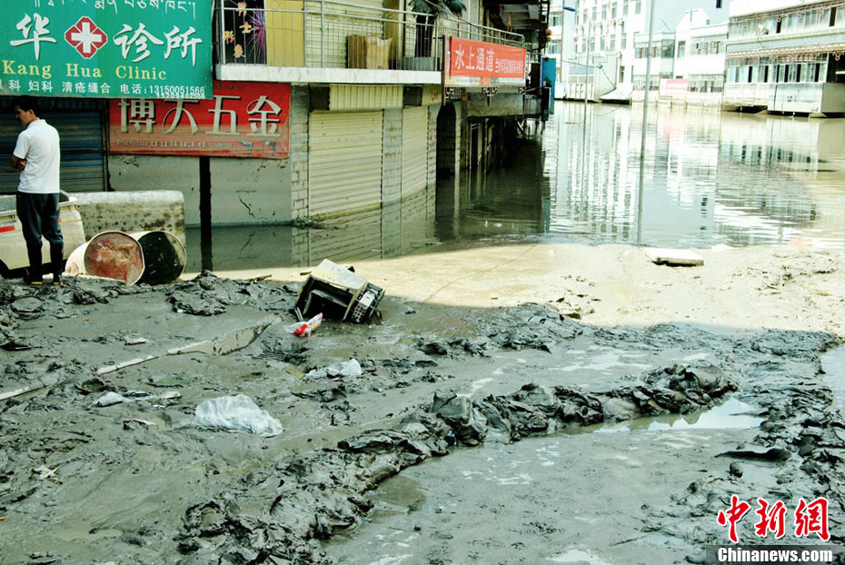 8月25日,隨著白龍江水位下降,舟曲縣城被淹沒的房屋逐漸退出水面,可以發(fā)現(xiàn),水退之處,淤泥滿地。中新社記者 侯志紅 攝