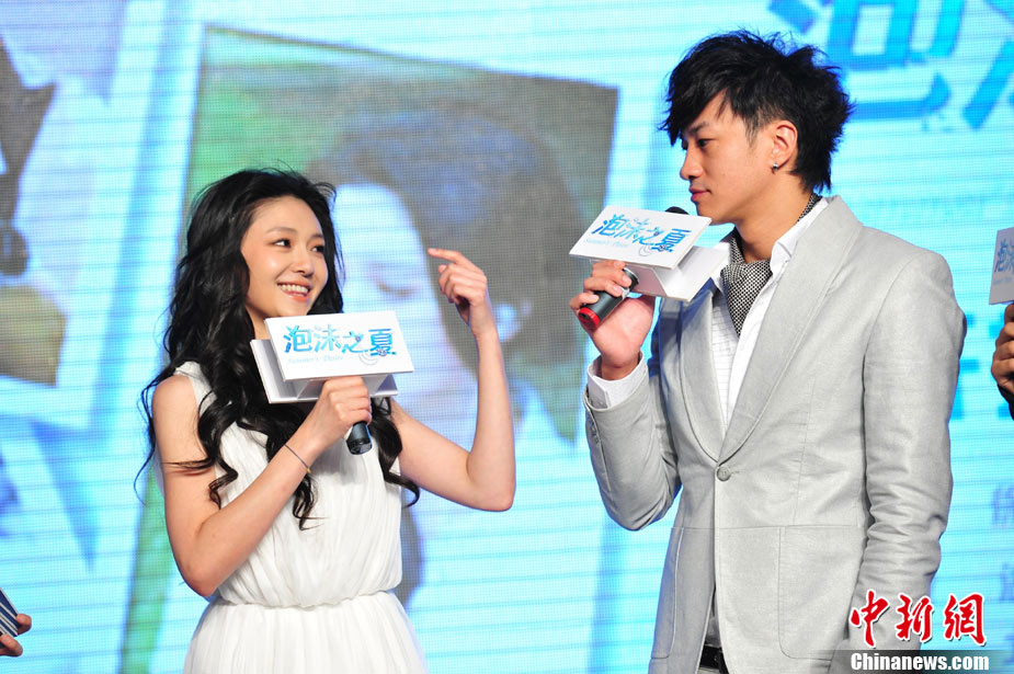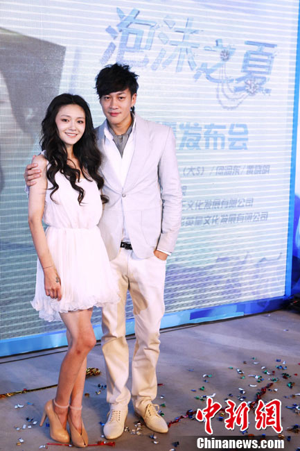 8月25日,偶像劇《泡沫之夏》在北京舉行了開(kāi)播發(fā)布會(huì),主演大S與何潤(rùn)東出席。時(shí)尚女王大S浪漫卷發(fā)和夢(mèng)幻白裙造型似童話中的公主,與“夢(mèng)幻泡沫 浪漫之夏”的主題十分貼合。何潤(rùn)東也默契地以西裝出席,兩人十分登對(duì);顒(dòng)中,這對(duì)不斷傳出緋聞的熒屏最佳搭檔不僅毫不避嫌地互相夸獎(jiǎng),何潤(rùn)東還當(dāng)眾與大S頻頻用手機(jī)自拍親密合影停不下來(lái),還現(xiàn)場(chǎng)將自拍照上載至微博。中新社記者 李學(xué)仕 攝