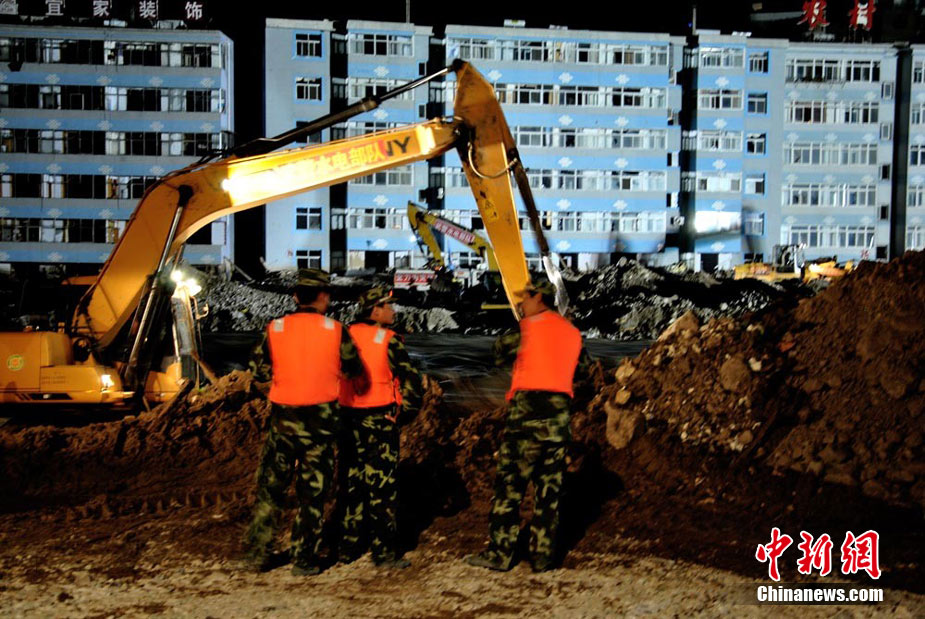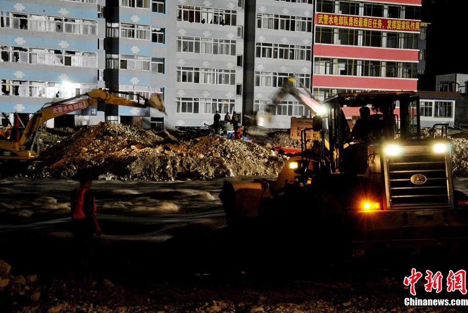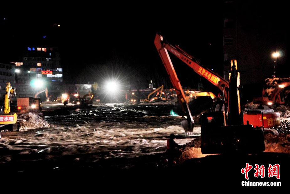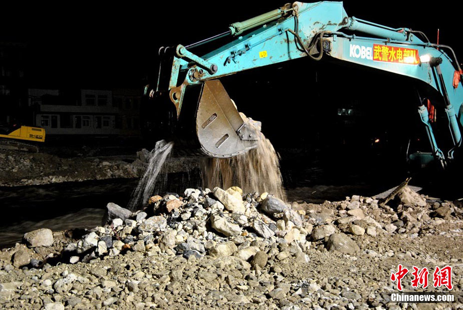 為盡快消除舟曲特大泥石流形成的白龍江堰塞體,疏通河道,早日解除舟曲縣城水患,武警水電部隊(duì)官兵日夜艱苦奮戰(zhàn)在在1.5公里的白龍江兩岸搶險(xiǎn)一線, 24小時(shí)晝夜挖掘和清理河道中的碎石淤泥,到目前水位下降已3米多 縣城淹沒房屋逐退水面。白龍江堰塞體搶險(xiǎn)工作已全面進(jìn)入沖刺階段,圖為8月26日晚11時(shí)左右武警水電部隊(duì)官兵夜戰(zhàn)白龍江的施工現(xiàn)場(chǎng)。中新社記者 侯志紅 攝