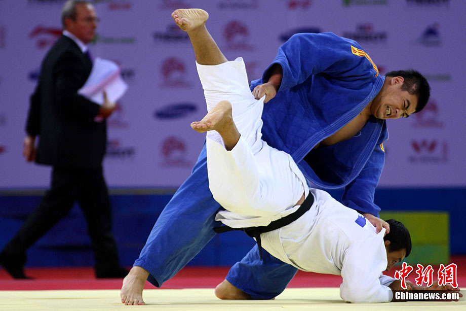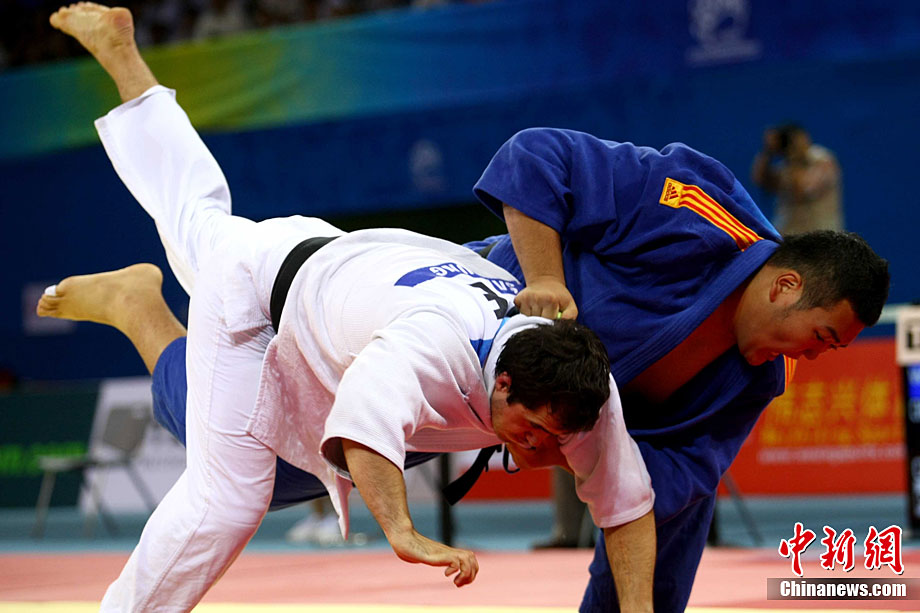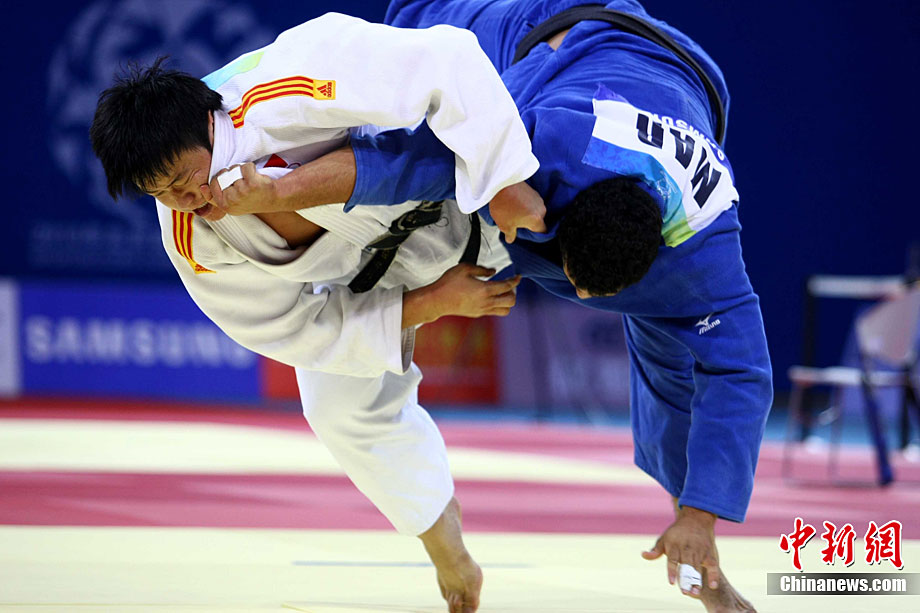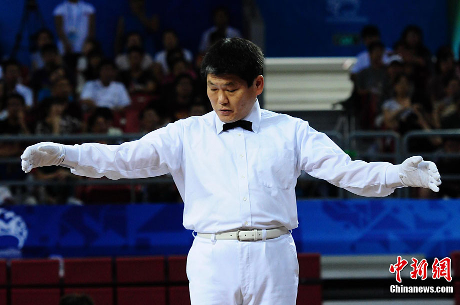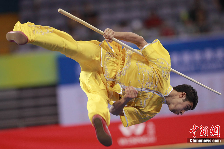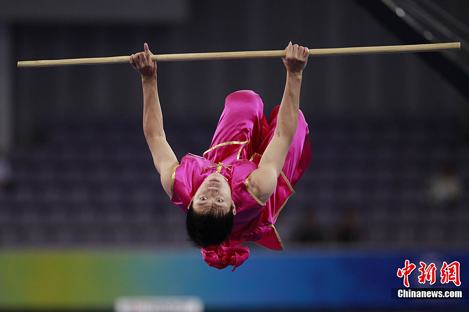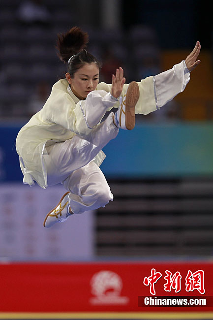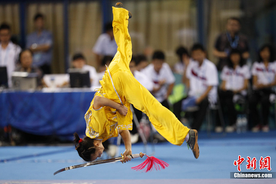 8月28日,2010年北京首屆武會進行首日比賽,其中武術(shù)項目的比賽在北京奧林匹克體育中心體育館進行。圖為中國香港選手Zheng Tian Hui在女子劍術(shù)的比賽中以9.80分穩(wěn)居第一位。中新社記者 盛佳鵬 攝