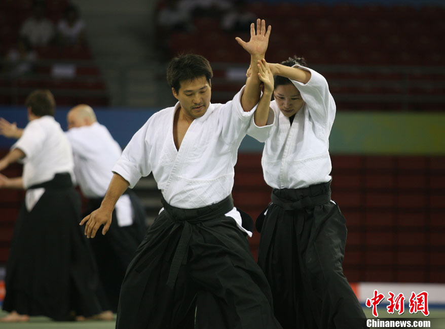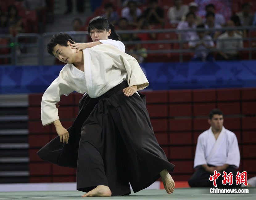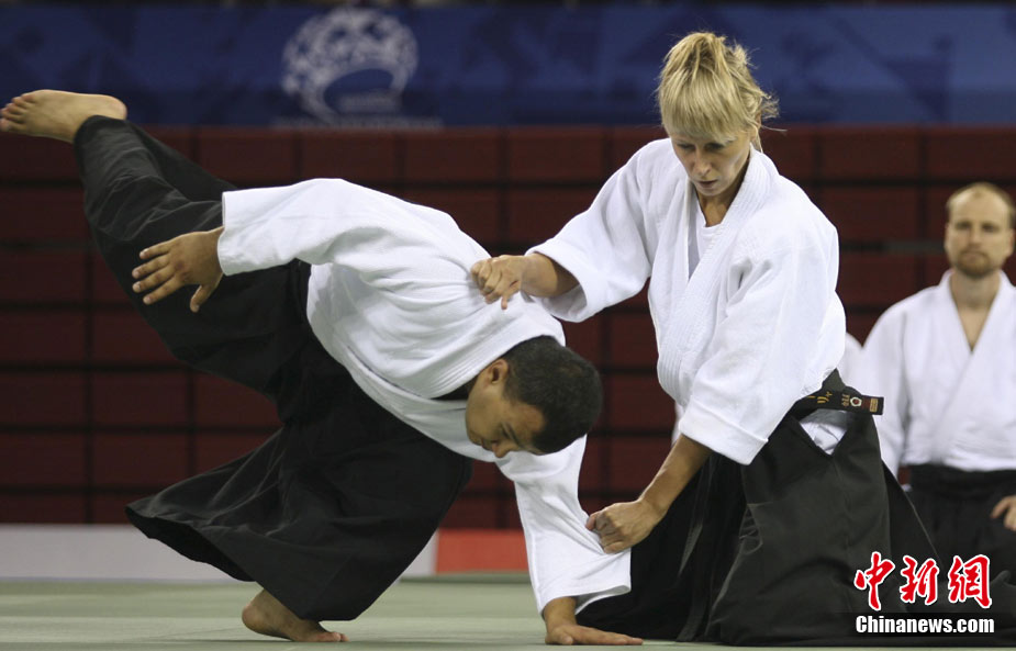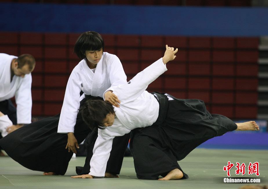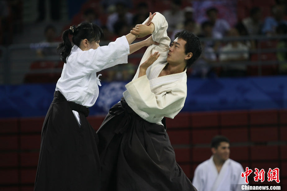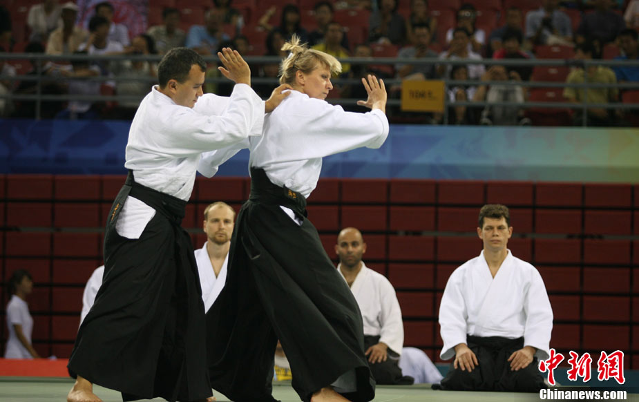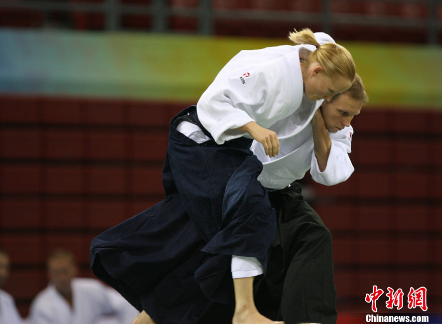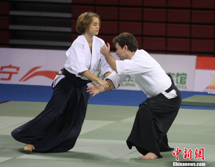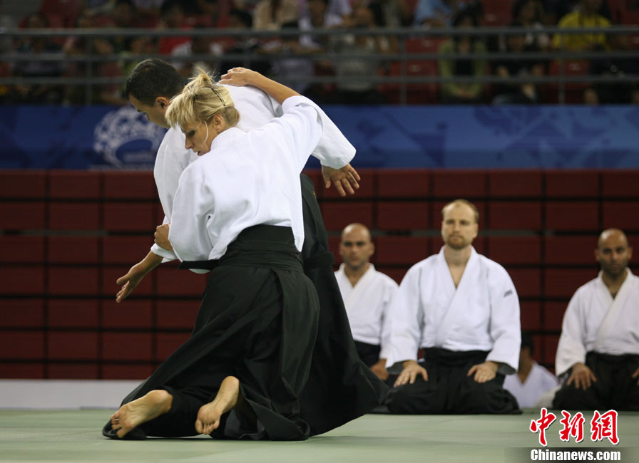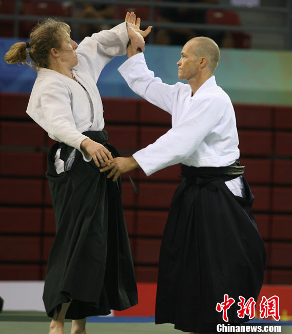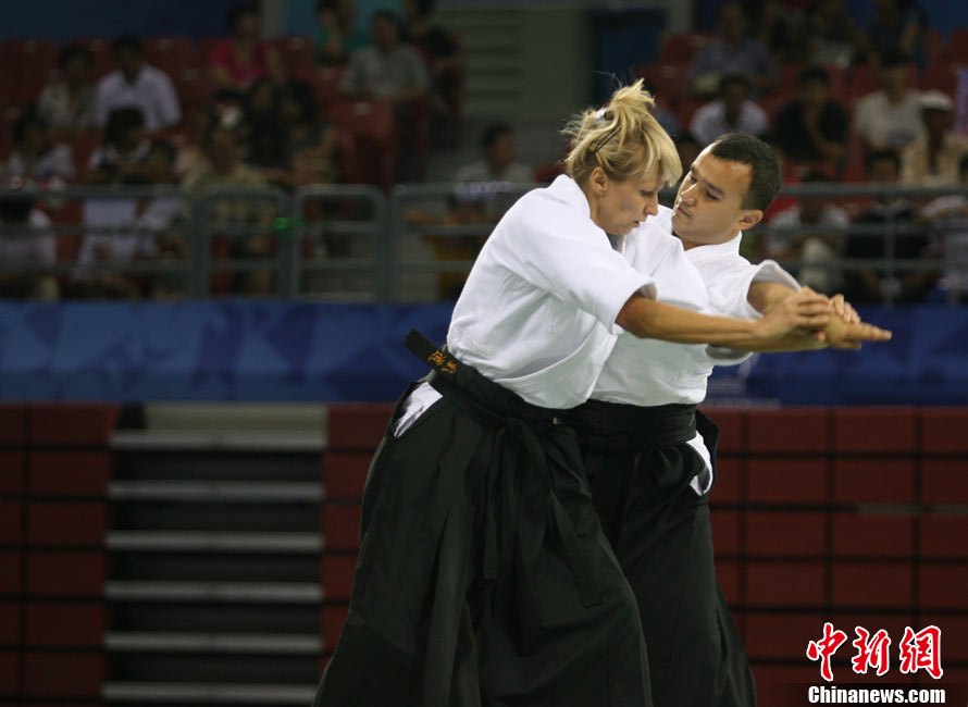 8月30日,一對選手在北京首屆武搏會合氣道賽場上對決,其動作與曼妙的舞姿竟有些神似。合氣道是一種根源于日本大東流合氣柔術的近代武術,合氣道不注重比賽的勝負,沒有跟別人較量的思想,而是跟他人一起鍛煉和修養(yǎng)自己,因此才會有鮮見的異性同場對決的場面出現(xiàn)。本次武搏會,合氣道將作為表演項目,無特別的規(guī)則,因此不能夠嚴格地定義勝利者或者失敗者。國際合氣道聯(lián)合會將組織高段教官來評判各項表演,表演賽分為基本技巧、高級技巧和復合技巧等三個單元。中新社發(fā) 蘇丹 攝