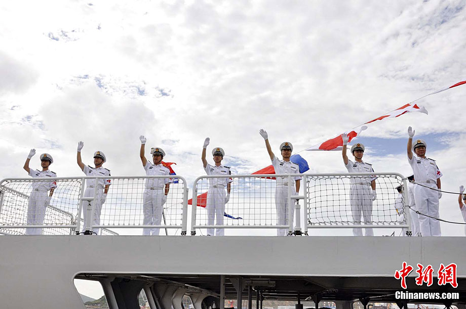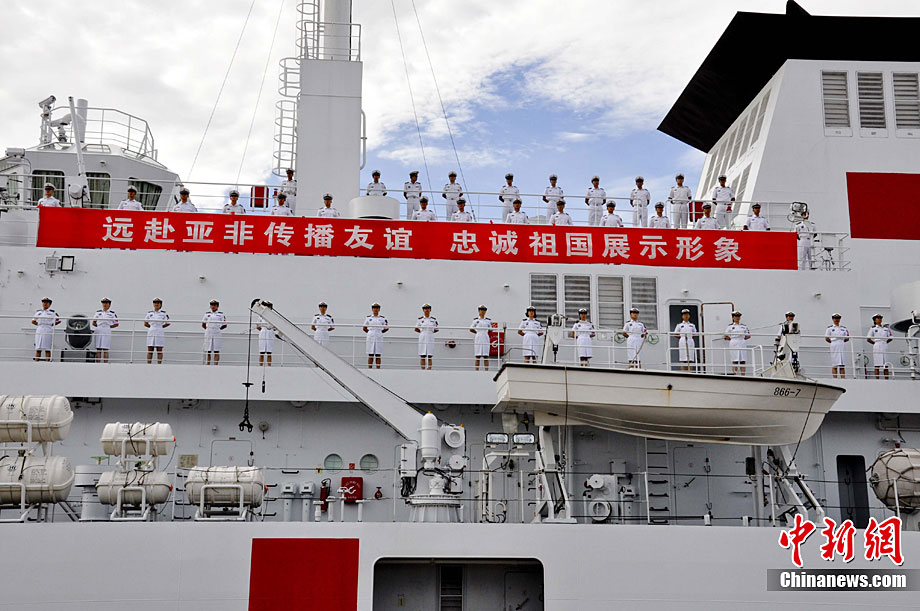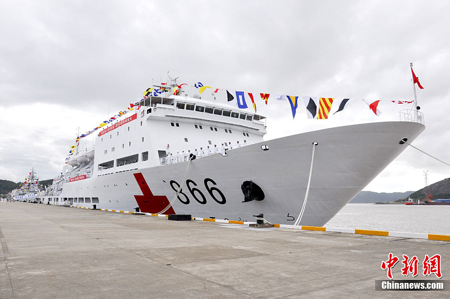 8月31日,經(jīng)中央軍委批準(zhǔn),由中國(guó)自行研制的世界首艘萬(wàn)噸級(jí)“和平方舟”號(hào)醫(yī)院船從舟山某軍港啟航,前往亞丁灣海域及吉布提、肯尼亞、坦桑尼亞、塞舌爾、孟加拉五國(guó)執(zhí)行“和諧使命——2010”任務(wù)。這是中國(guó)“和平方舟”號(hào)醫(yī)院船首次赴國(guó)外執(zhí)行巡診及醫(yī)療服務(wù)任務(wù)。圖片來(lái)源:cnsphoto 胡善敏 攝
