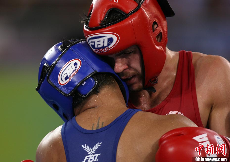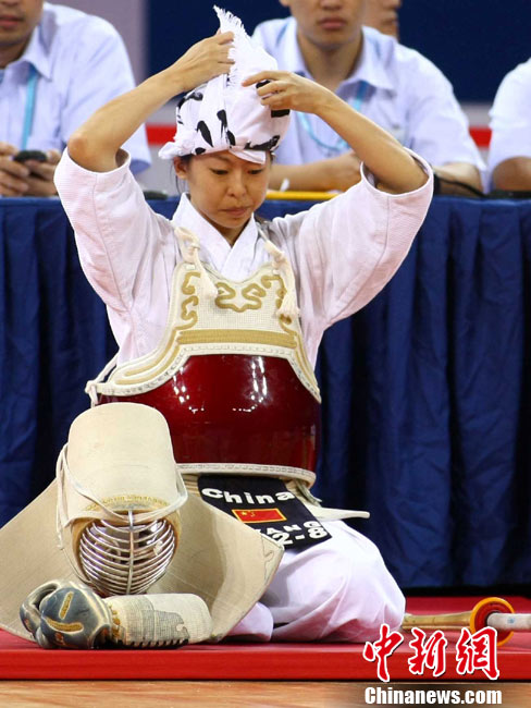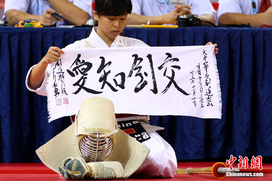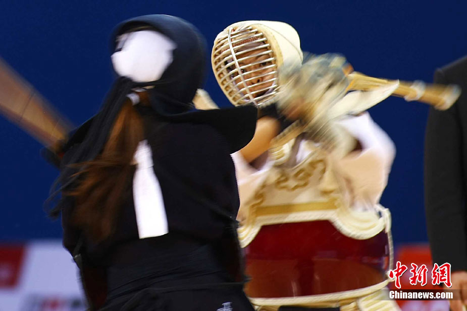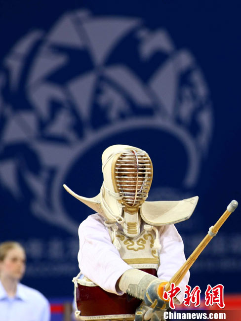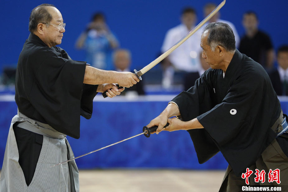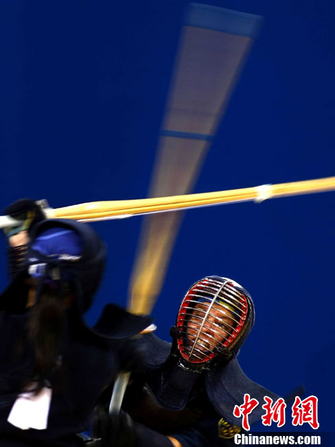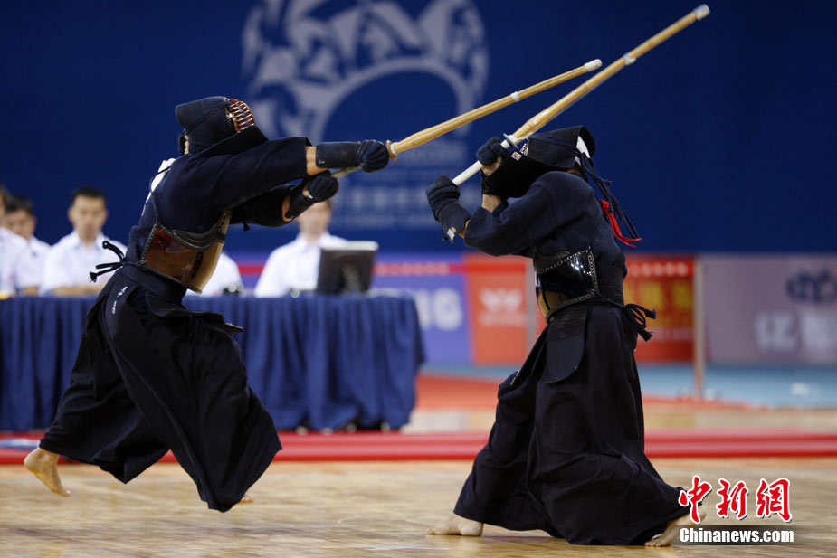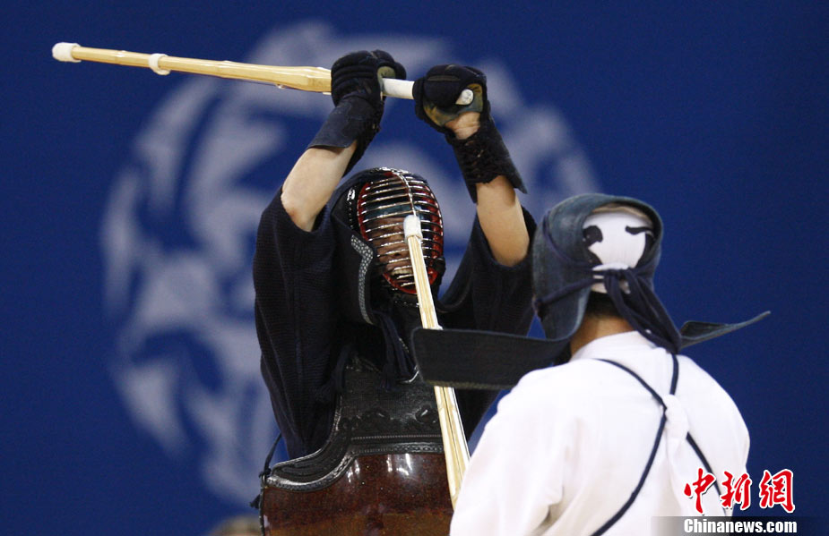 9月3日,2010年北京首屆世界武搏運動會劍道比賽在北京科技大學體育館開賽,當天舉行男、女個人賽預賽和決賽及女子特殊邀請賽預賽和決賽。圖為在男子個人邀請賽中,日本選手昭司寺本(Shoji TERAMOTO)(右)和巴西選手奧納卡(Ernesto Eisaku ONAKA)在比賽中。中新社記者 盛佳鵬 攝