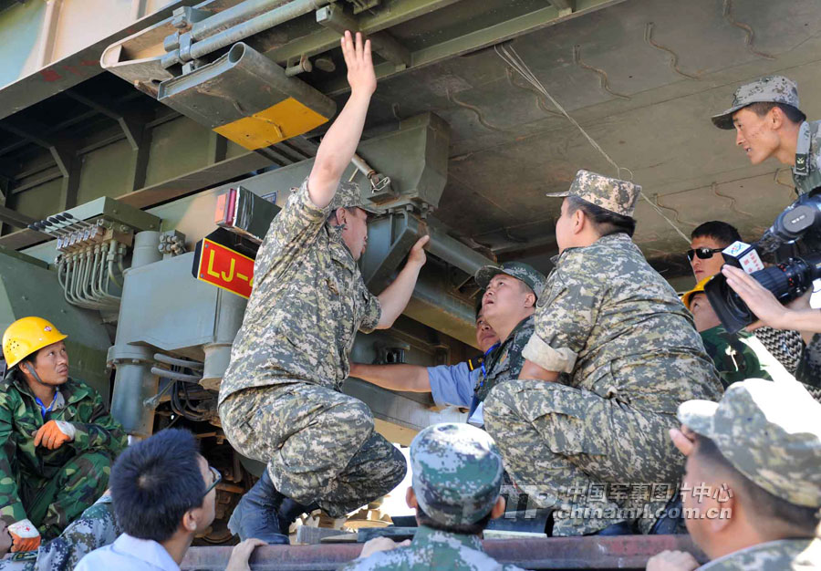 顧不上長途奔波和路途勞累的參演官兵,到達(dá)換裝點(diǎn)后就立即開始了換乘換裝。經(jīng)過近6小時(shí)的卸載、裝載,中方參演部隊(duì)的裝備車輛全部駛上了哈方軍列,并在鐵路專業(yè)裝卸隊(duì)的協(xié)助下,對20噸以上輪式裝備按照哈方的要求進(jìn)行捆綁加固。
