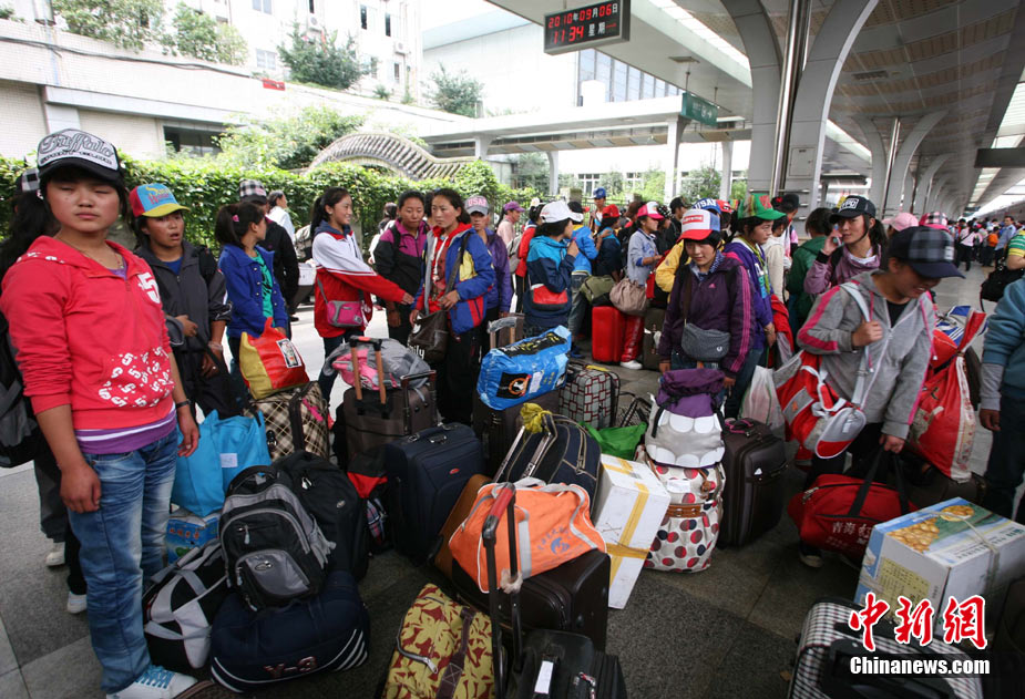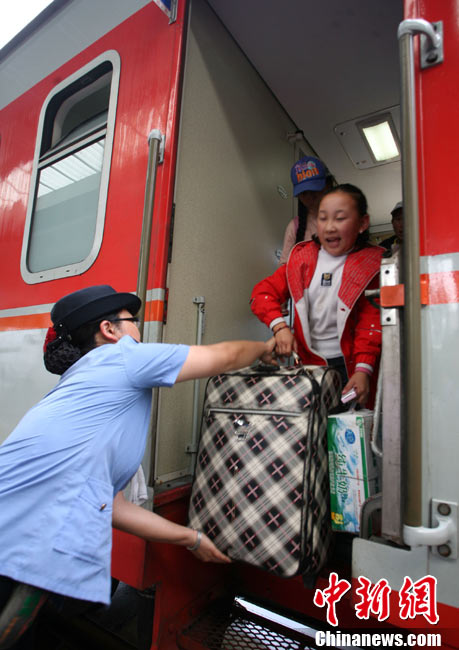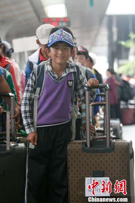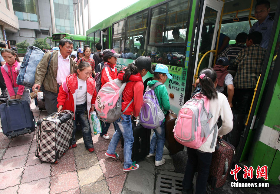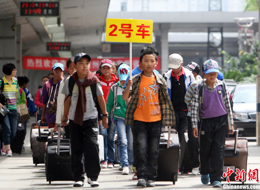 9月6日中午,青海省玉樹(shù)州地震災(zāi)區(qū)民族中學(xué)2013級(jí)初一、高一486名新生經(jīng)過(guò)長(zhǎng)途跋涉安全抵達(dá)成都,他們將在四川都江堰八一聚源中學(xué)異地過(guò)渡。至此,玉樹(shù)州民族中學(xué)成建制轉(zhuǎn)移安置工作全部結(jié)束。圖為玉樹(shù)州民族中學(xué)新生抵達(dá)成都火車(chē)站。 中新社發(fā) 劉忠俊 攝