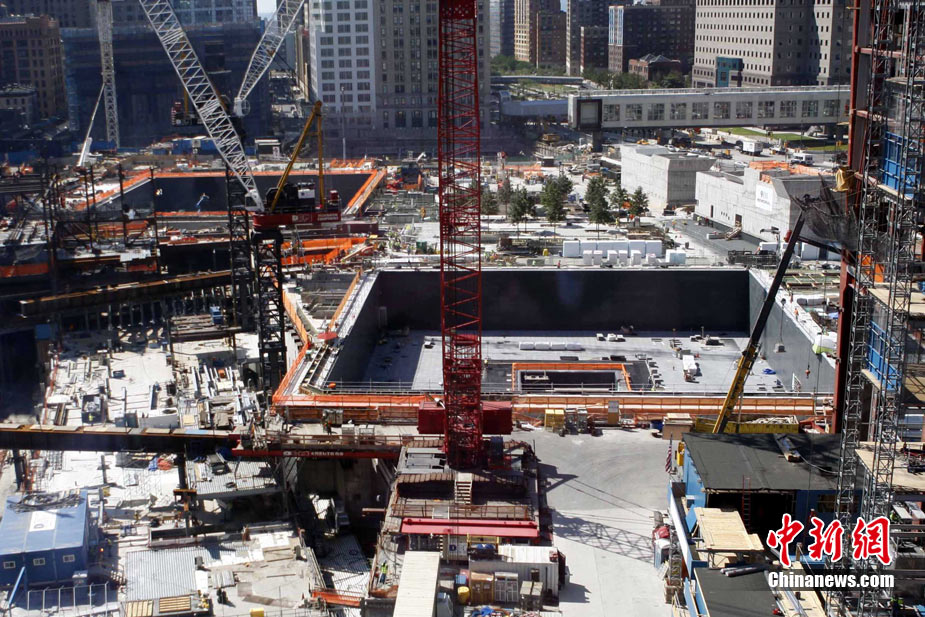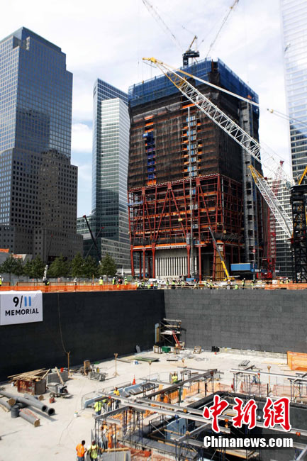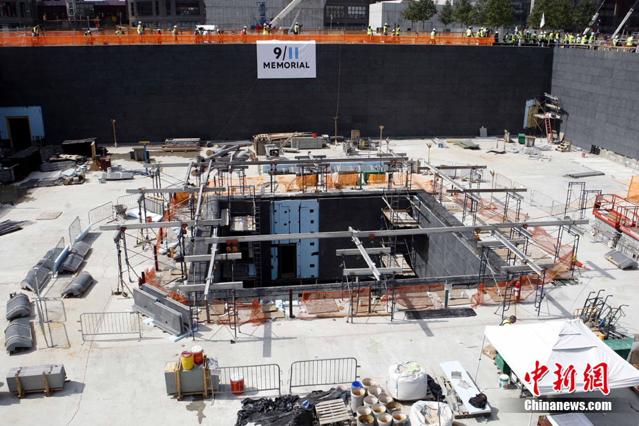美國(guó)當(dāng)?shù)貢r(shí)間9月7日,記者在紐約世貿(mào)建筑工地現(xiàn)場(chǎng)看到,以原先世貿(mào)雙子塔樓基座為主體的兩個(gè)方形瀑布池業(yè)已成型,周圍也種上了些許綠樹。9·11紀(jì)念館館長(zhǎng)喬·丹尼爾斯表示,肯定將在事件十周年紀(jì)念日當(dāng)天開館。中新社記者 孫宇挺 攝
