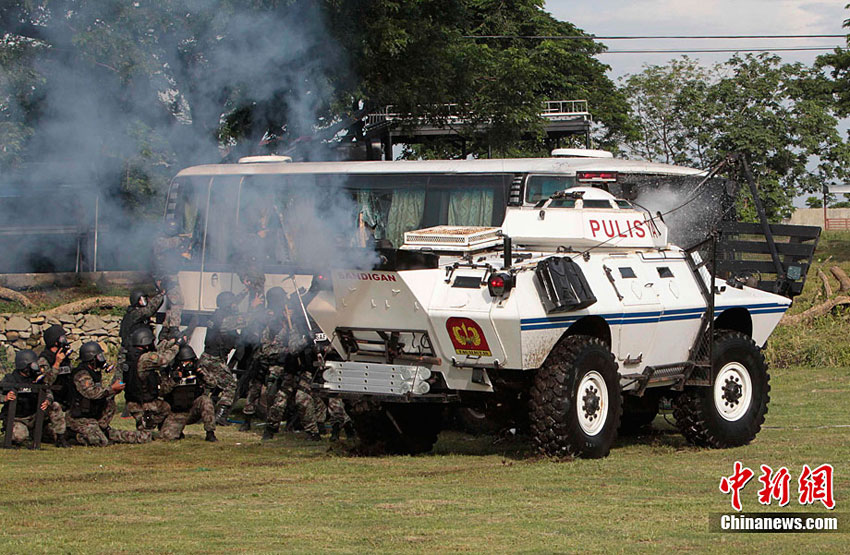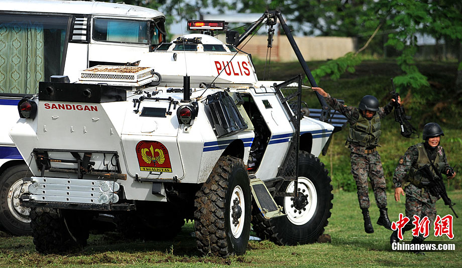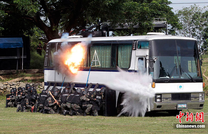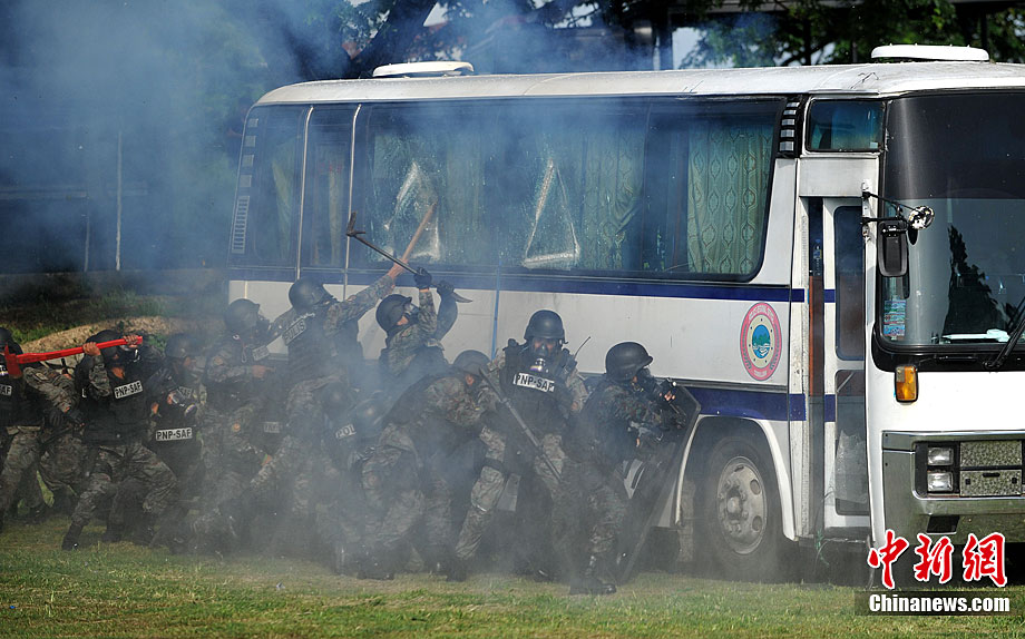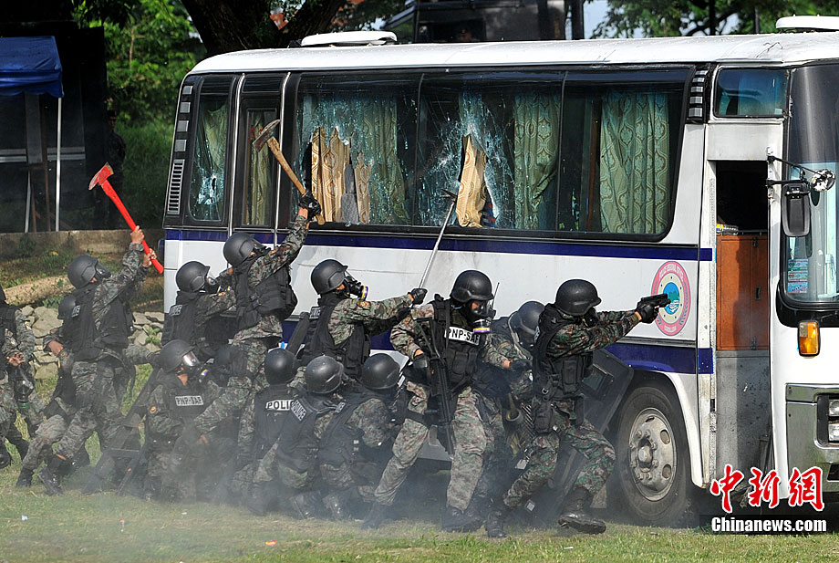 當(dāng)?shù)貢r(shí)間9月9日,菲律賓警察特別行動(dòng)部隊(duì)成員在菲律賓首都馬尼拉附近的營地舉行了人質(zhì)救援演習(xí)。菲律賓總統(tǒng)阿基諾三世親自前往觀看該救援演習(xí)。