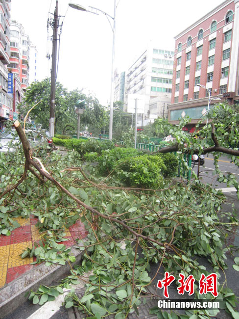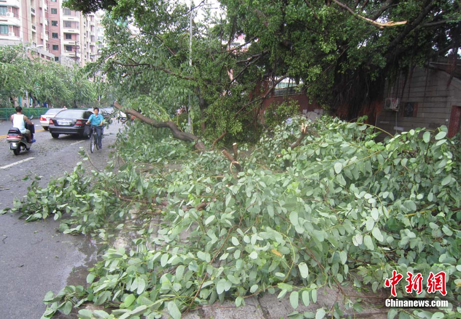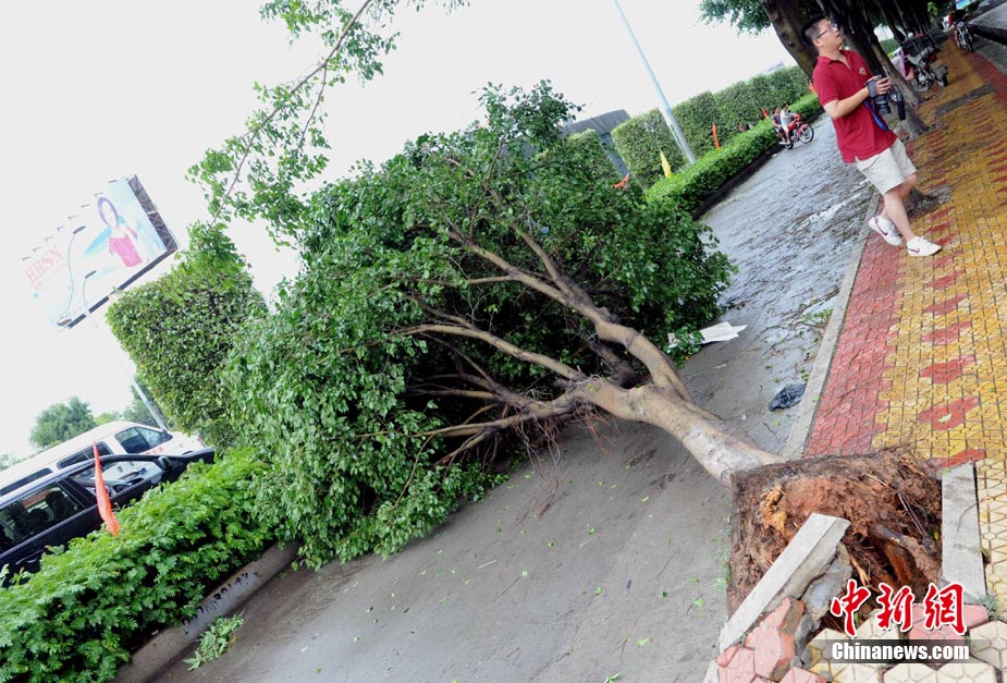 今年第10號(hào)臺(tái)風(fēng)“莫蘭蒂”10日凌晨3時(shí)30分登陸福建石獅,近中心最大風(fēng)力12級(jí)(35米/秒),給泉州帶來了狂風(fēng)暴雨。圖為9月10日上午臺(tái)風(fēng)過后、泉州市區(qū)觀音路上一棵被臺(tái)風(fēng)“莫蘭蒂”連根拔起的大樹,斜倒在路邊。中新社發(fā) 孫虹 攝