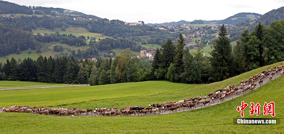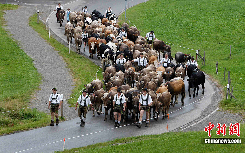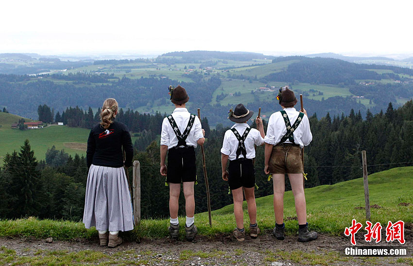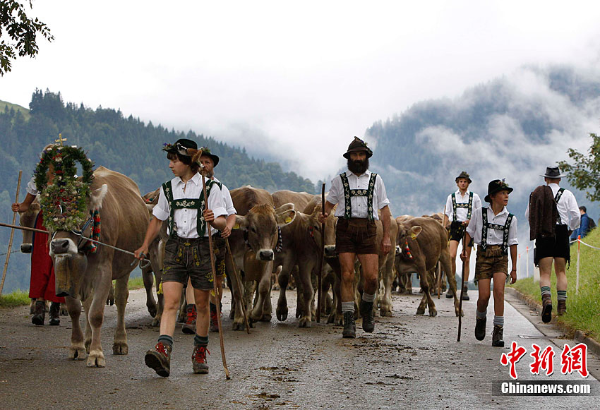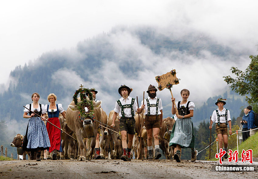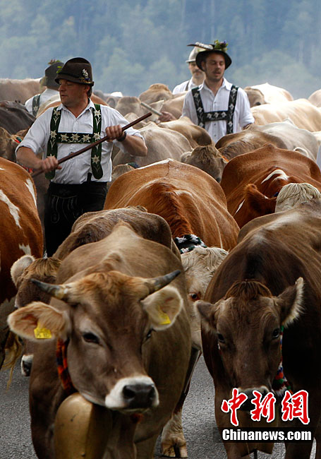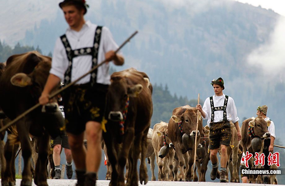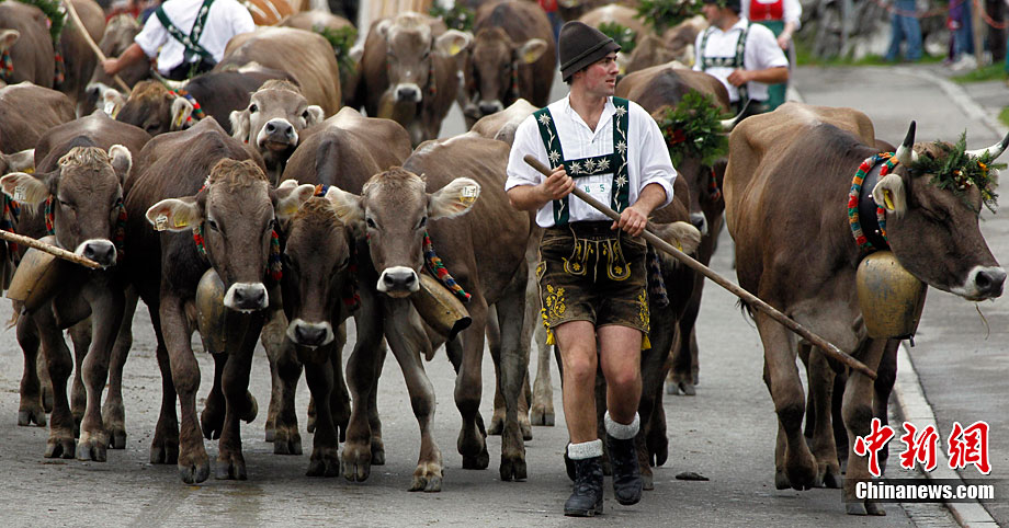 當(dāng)?shù)貢r間9月10日,德國奧博斯托芬舉行傳統(tǒng)的趕牛儀式。在山上待了一個夏天后,超過1200頭;氐缴焦,當(dāng)?shù)厝藭岩粋牛頭進行裝飾,以此紀(jì)念牛群安全歸來。