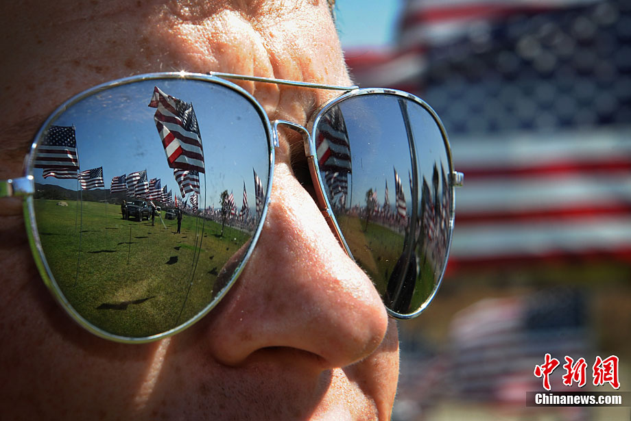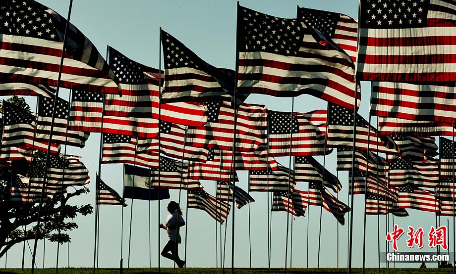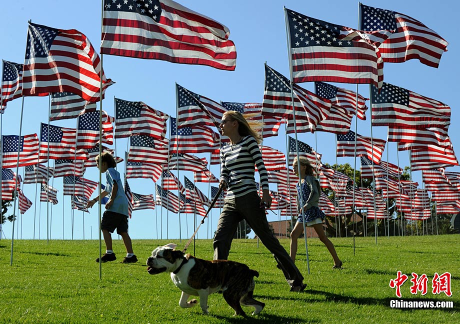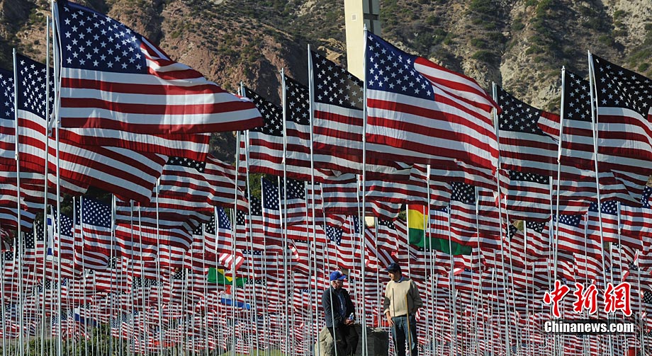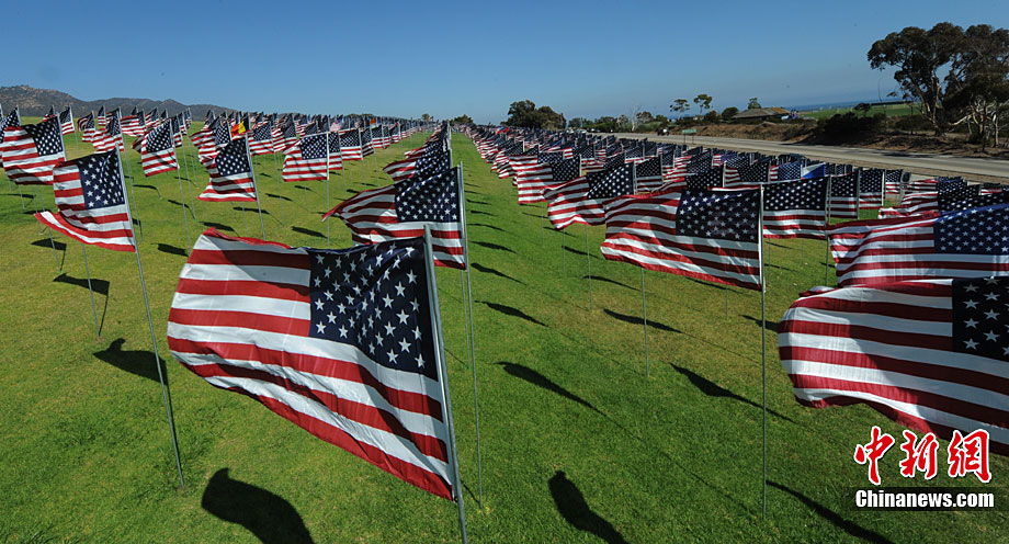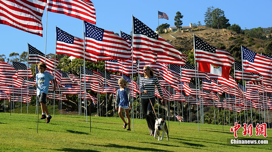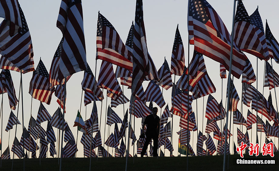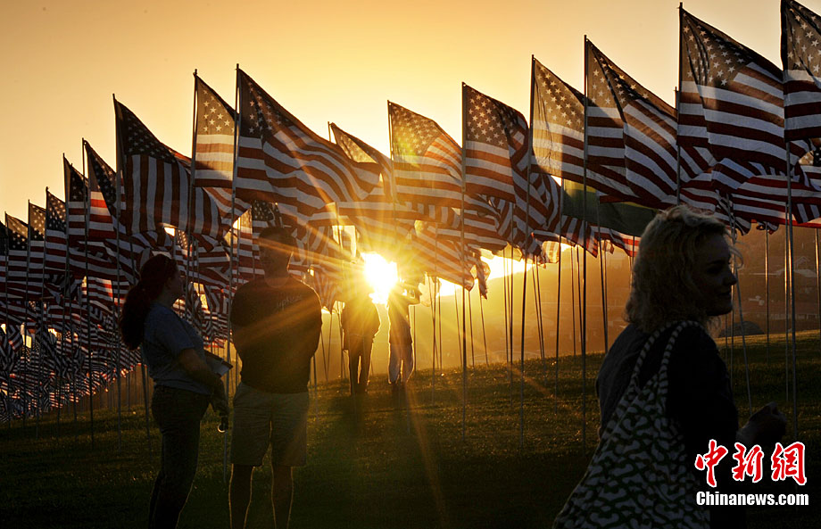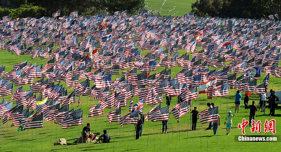 當?shù)貢r間9月10日,在美國加利福尼亞州的馬里布,一些大學(xué)生在馬里布佩珀代恩大學(xué)的草坪上插上近3000面美國國旗和其它國家和地區(qū)的旗幟,紀念“9·11”恐怖襲擊事件的遇難者。